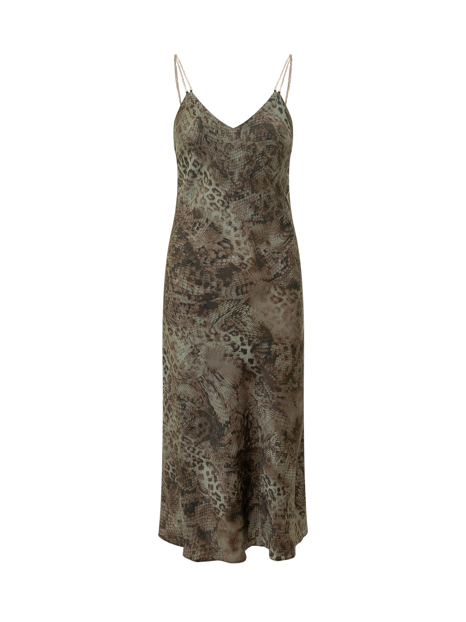 Abito lungo con scollo a V e spalline sottili. Stampa animalier all over e linea fluida.