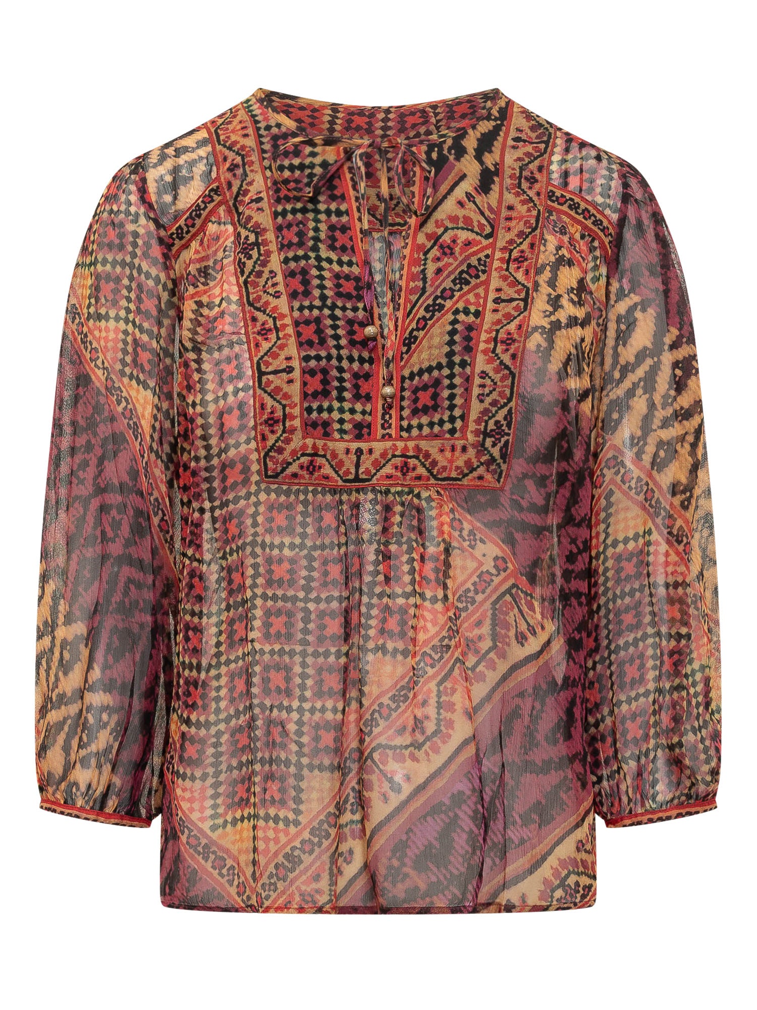 Blusa con scollo a V e laccetti. Maniche a tre quarti e stampa geometrica all over.