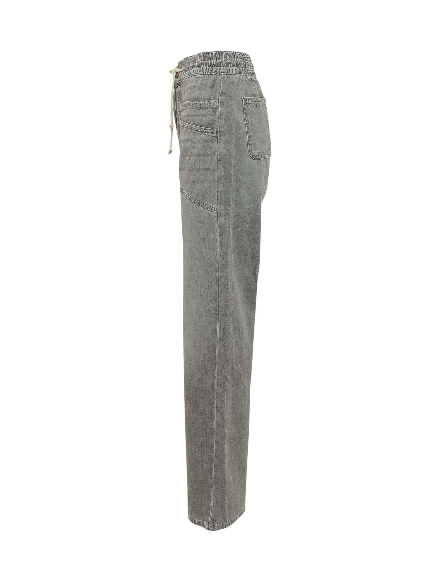 Pantaloni in denim con vita elasticizzata e coulisse regolabile. Tasche applicate e gamba ampia.