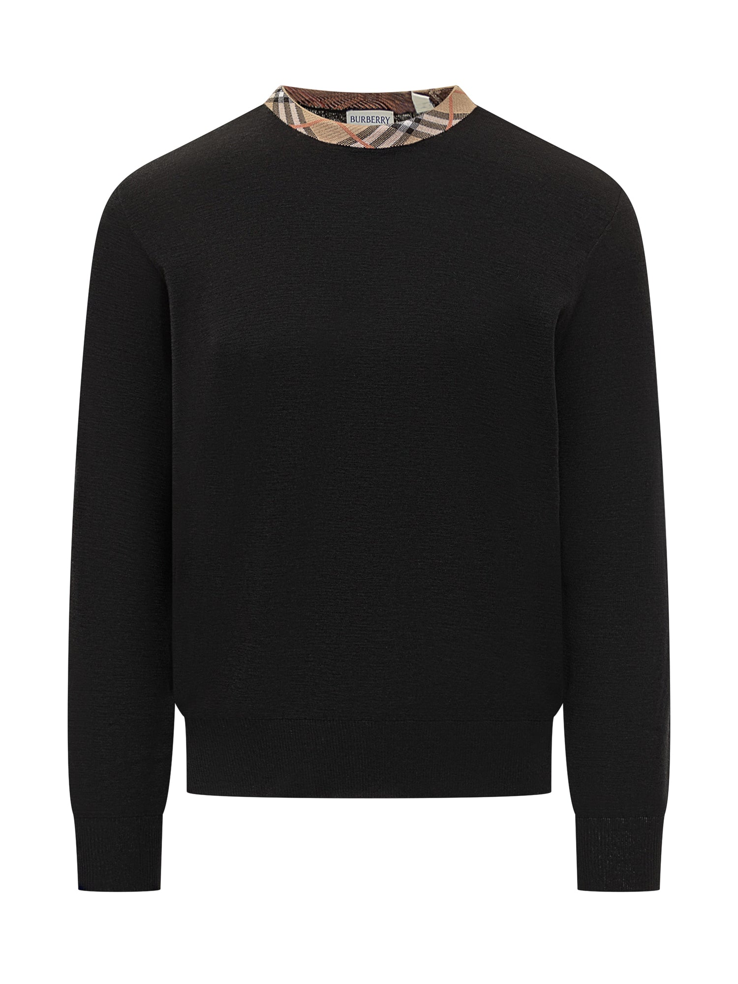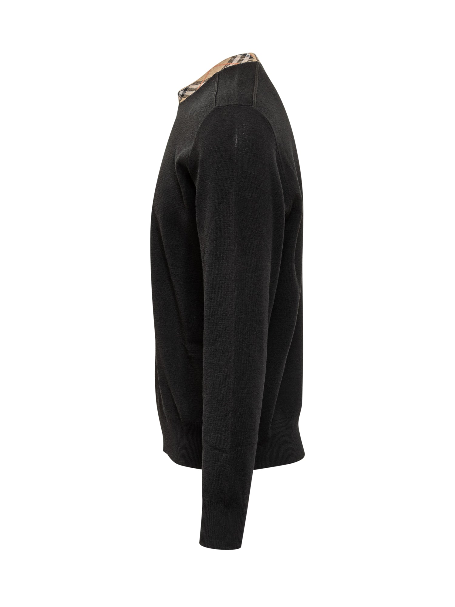 Maglia in lana nera con collo rifinito in iconico motivo check Burberry. Design essenziale ed elegante, perfetta per outfit casual-chic.