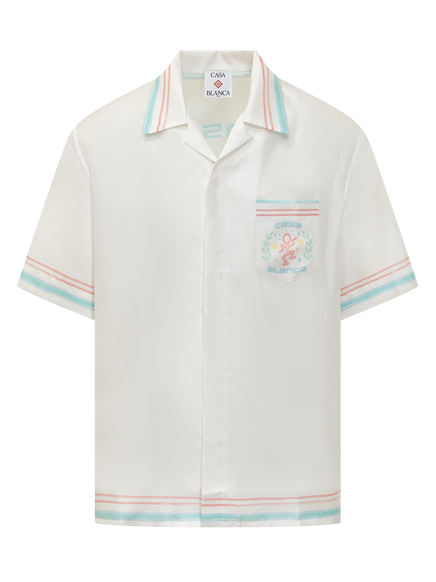 Camicia a maniche corte con silhouette rilassata e stampa Dance Joy sul taschino. Realizzata in tessuto leggero con profili a righe e colletto aperto.