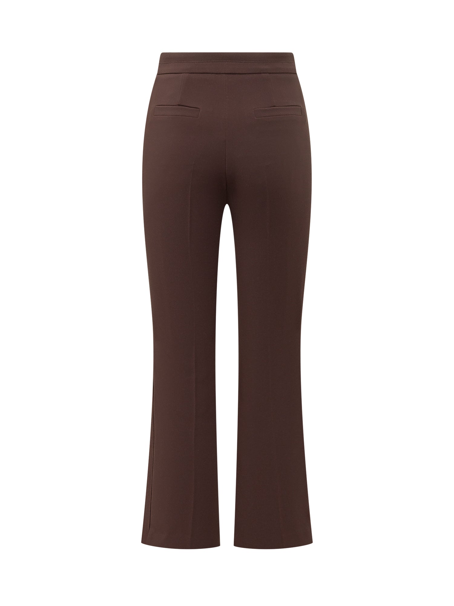 Pantalone marrone dal taglio elegante con linea leggermente svasata sul fondo, arricchito da piccoli bottoni decorativi alla caviglia. Silhouette slanciata e design essenziale, ideale per look sofisticati e contemporanei.