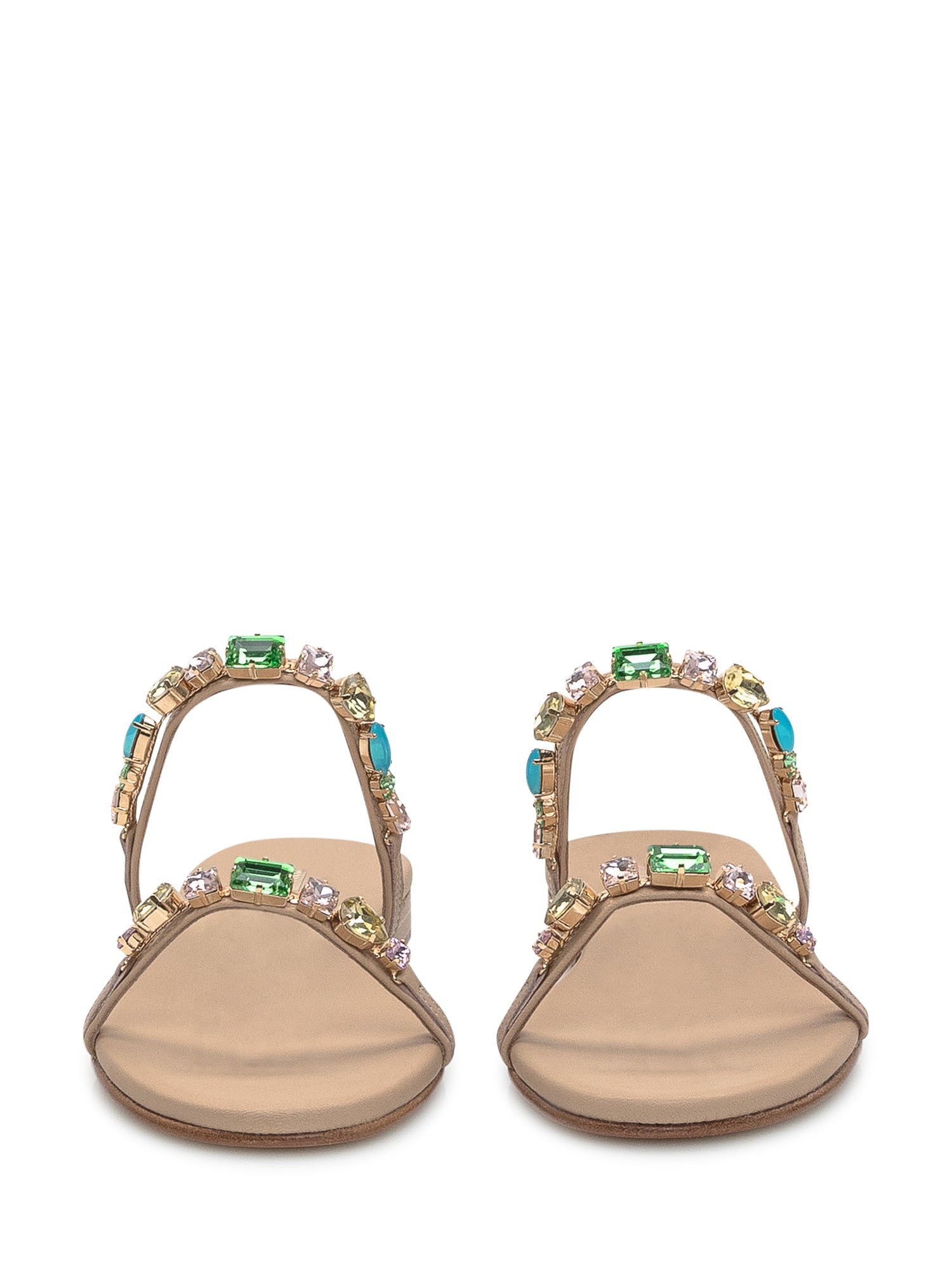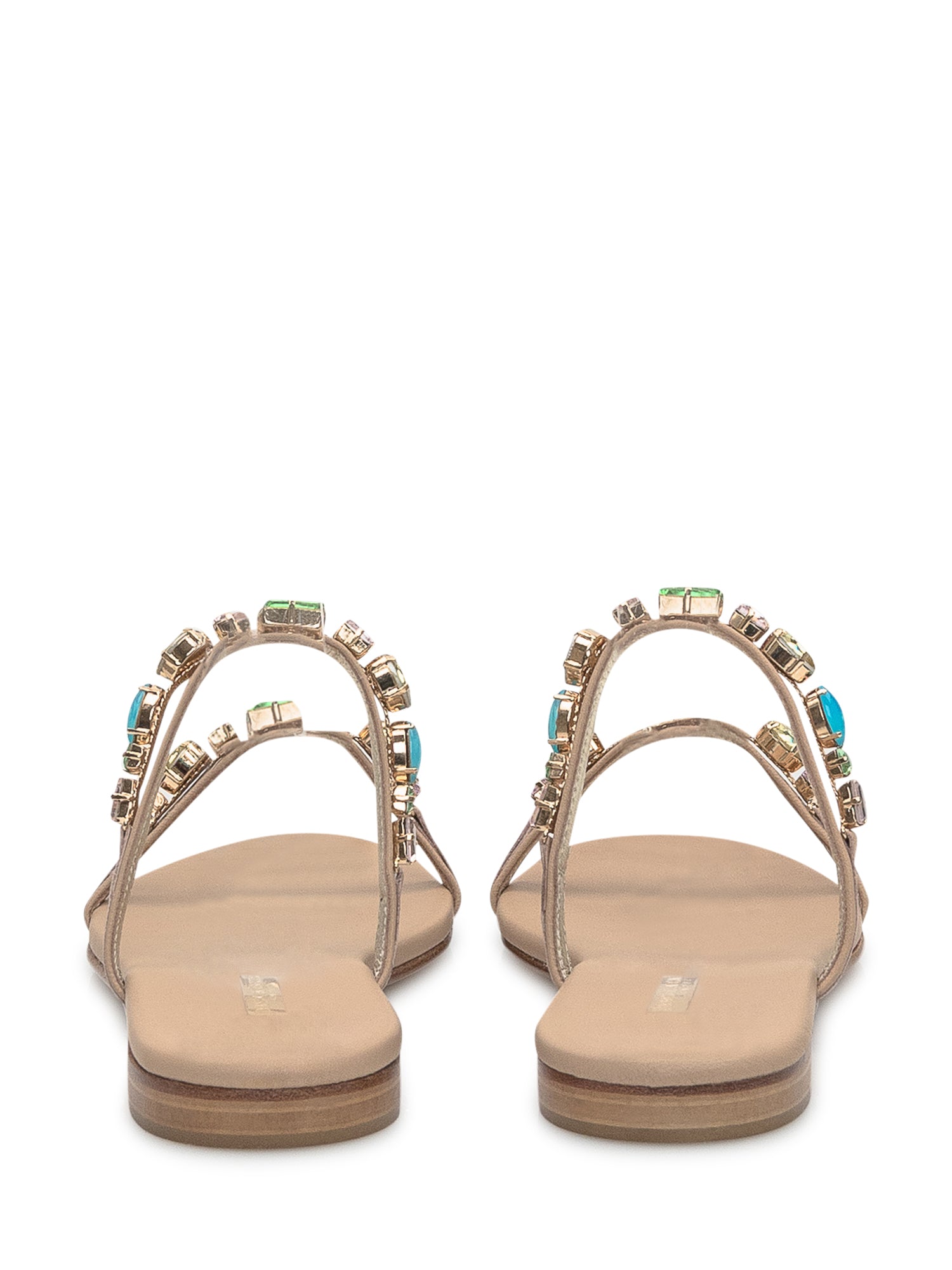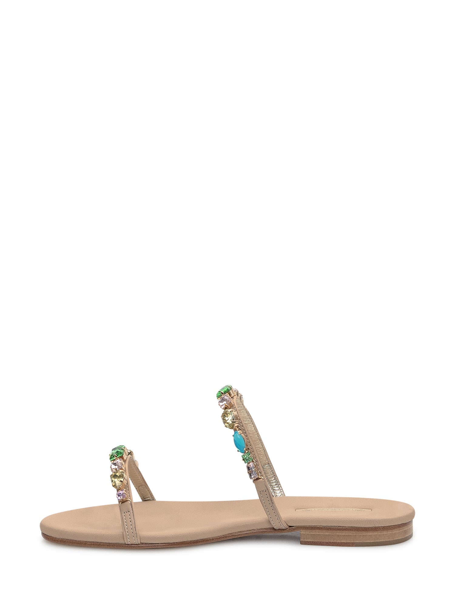 Sandalo doppia fascia monacale nappa fondotinta. Sottopiede rivestito. Pietre baguette multicolor.