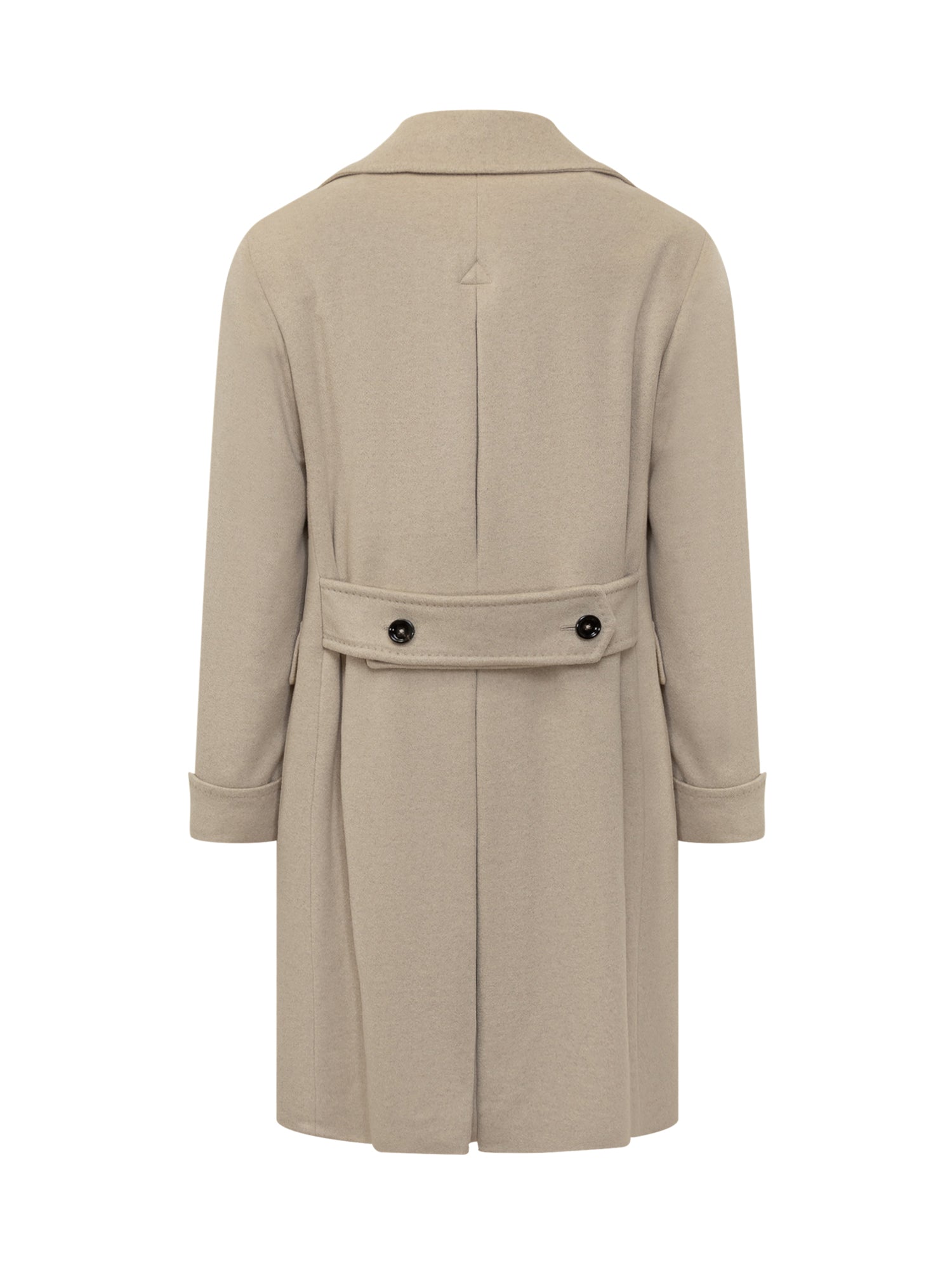 Cappotto Esterno in cashmere beige con chiusura doppiopetto, revers ampi e tasche con patta.