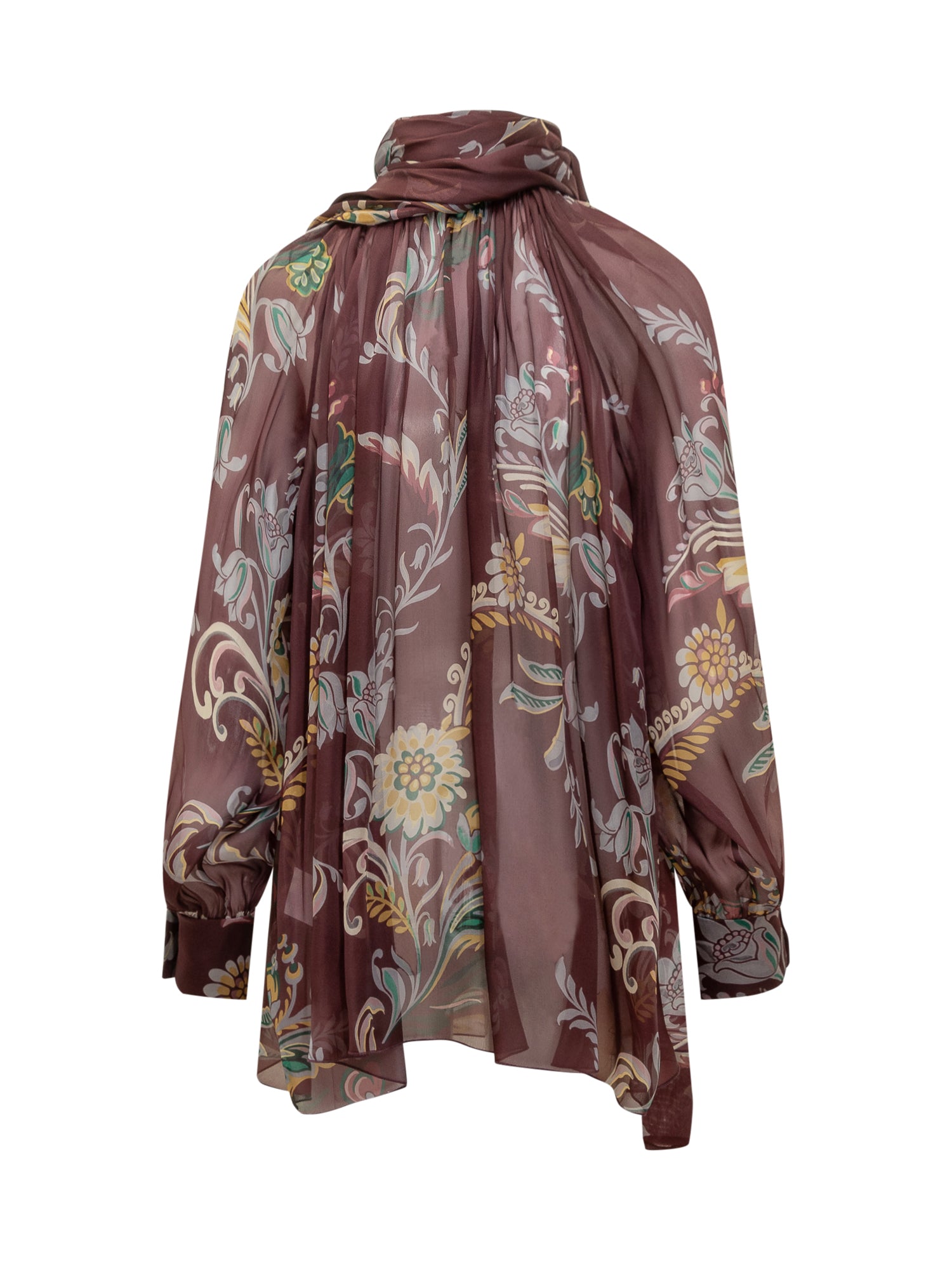 Blusa Etro in pura seta con elegante stampa floreale su base bordeaux. Modello ampio con fiocco al collo e maniche lunghe con polsino.