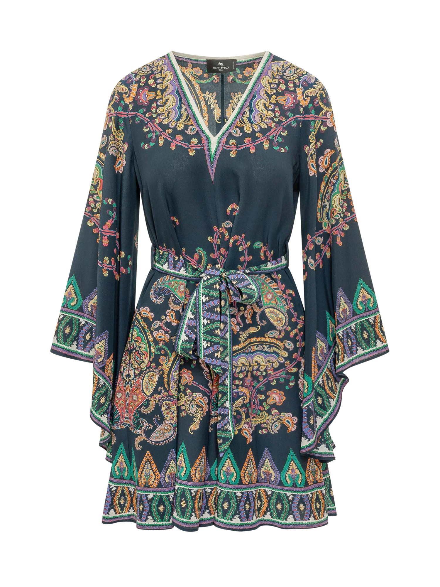 Abito corto stile blouson con fantasia decorativa all over. Scollo a V, maniche lunghe ampie e vita regolata da cintura coordinata. Gonna fluida con orlo leggermente svasato per un look femminile e dinamico.
