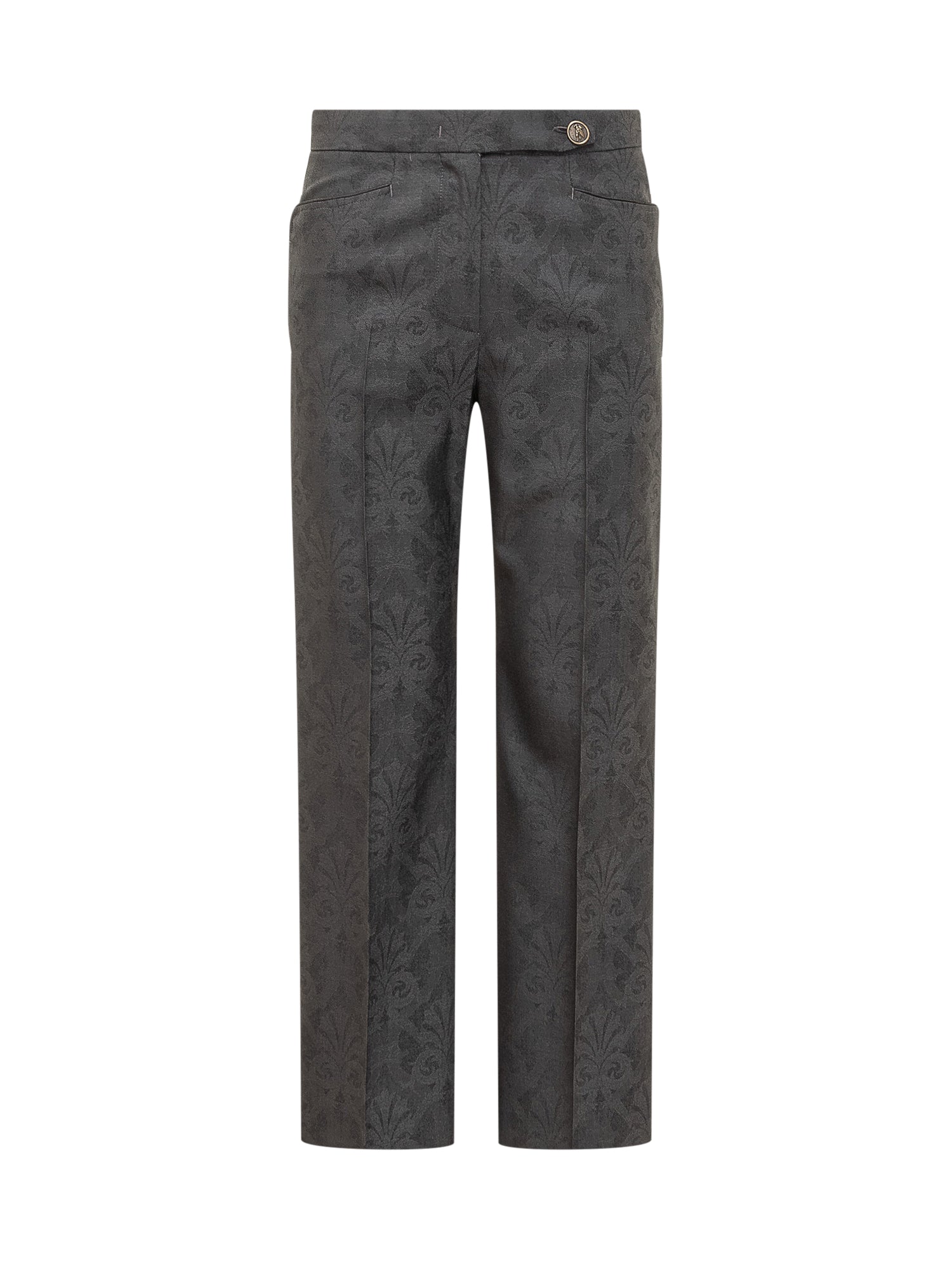 Pantalone nero in lana. Tasche sul davanti e sul retro. Chiusura con zip e bottone. Fantasia in jacquard all-over.
