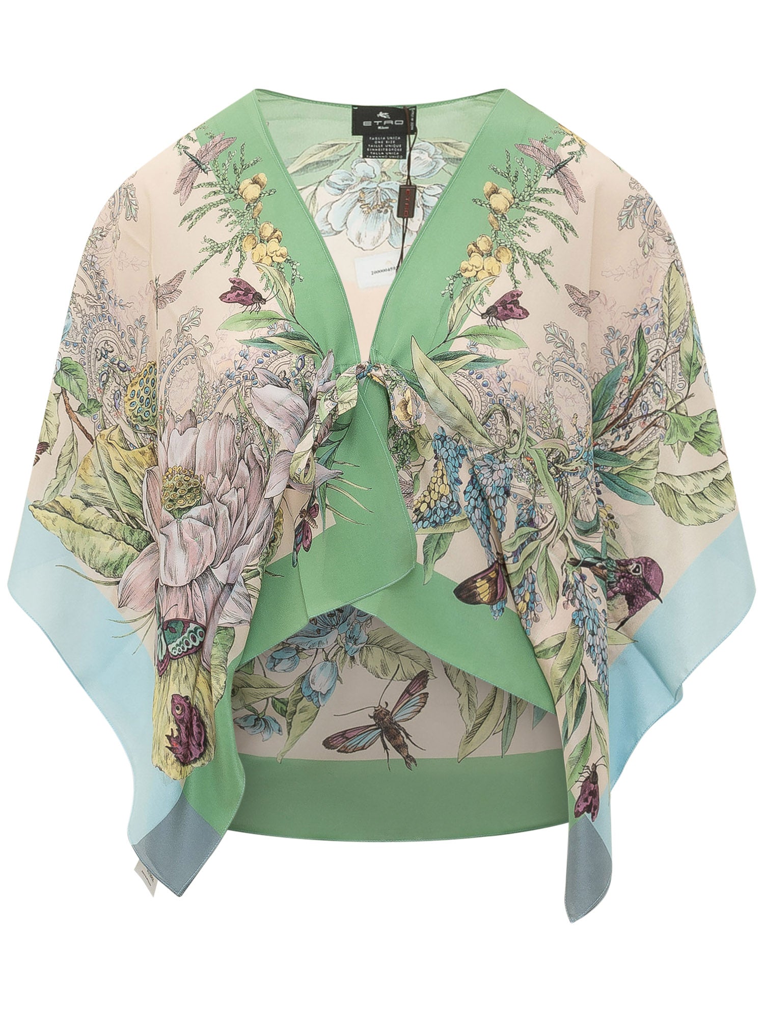 Poncho corto da donna, linea ampia e fluida, scollatura a v con nodo frontale, stampa botanica con dettagli naturalistici.