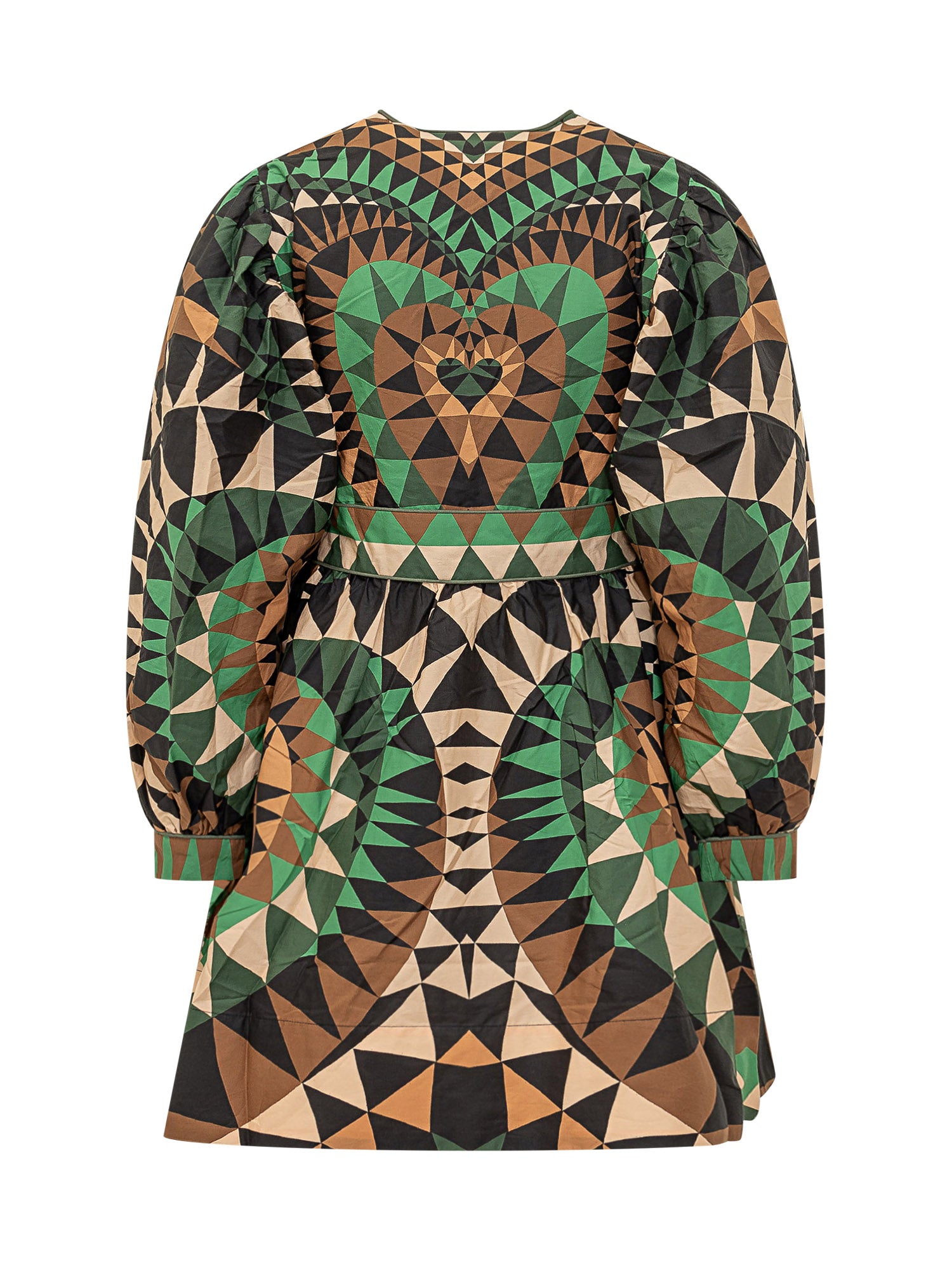 Abito corto a stampa geometrica con scollo profondo. Linea svasata con maniche lunghe e abbottonatura frontale.