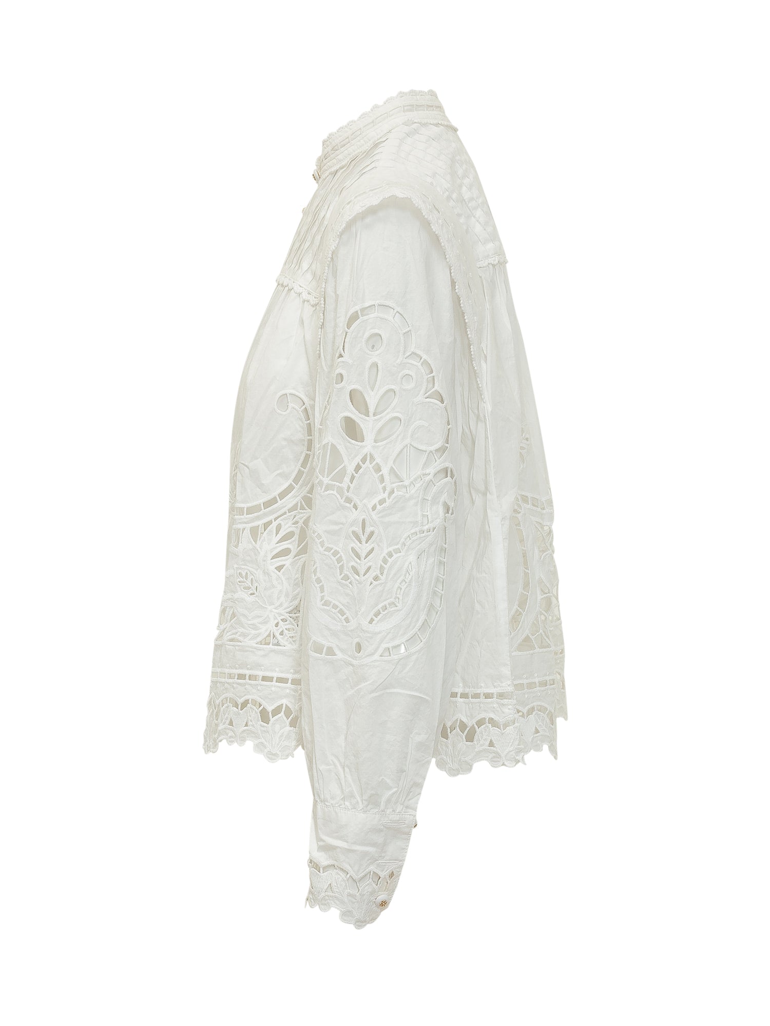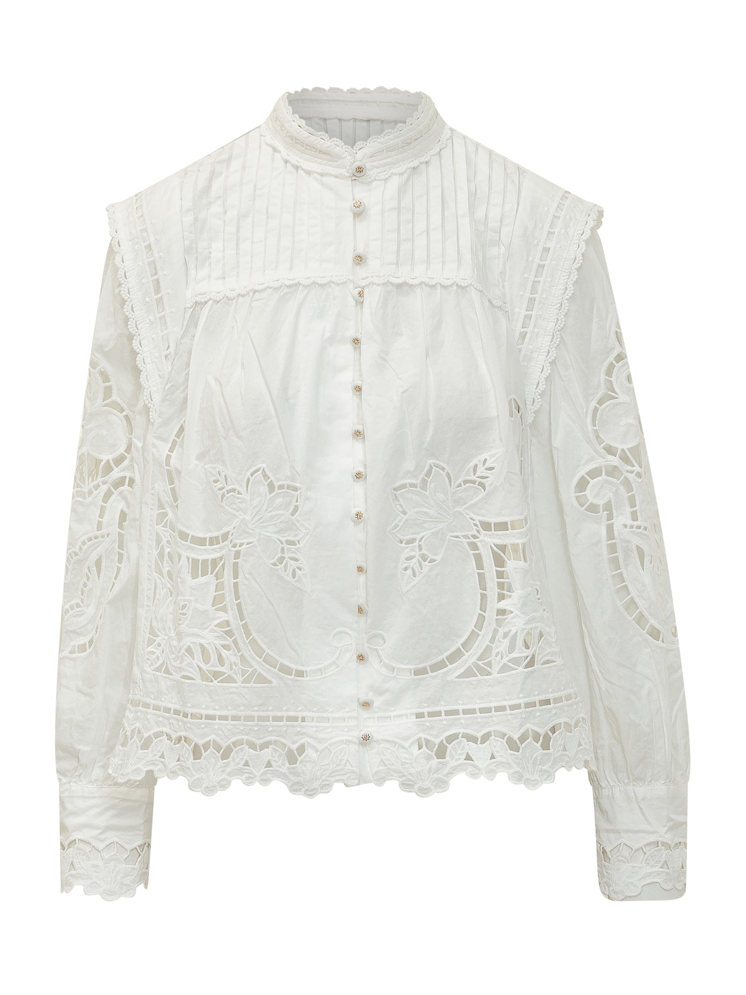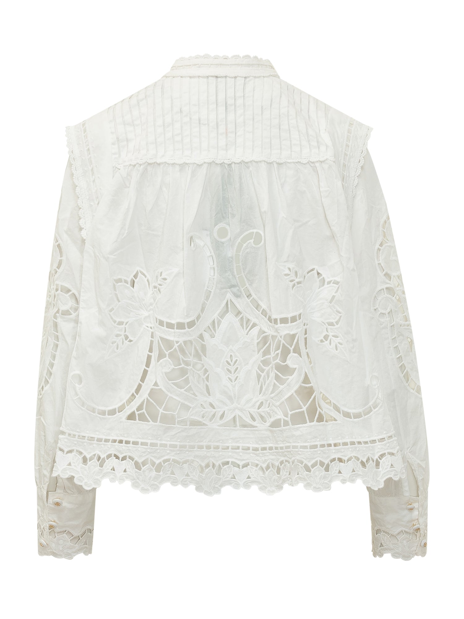 Blusa in cotone con ricami traforati e inserti sangallo. Modello leggero con bottoni frontali, maniche lunghe e bordo smerlato.