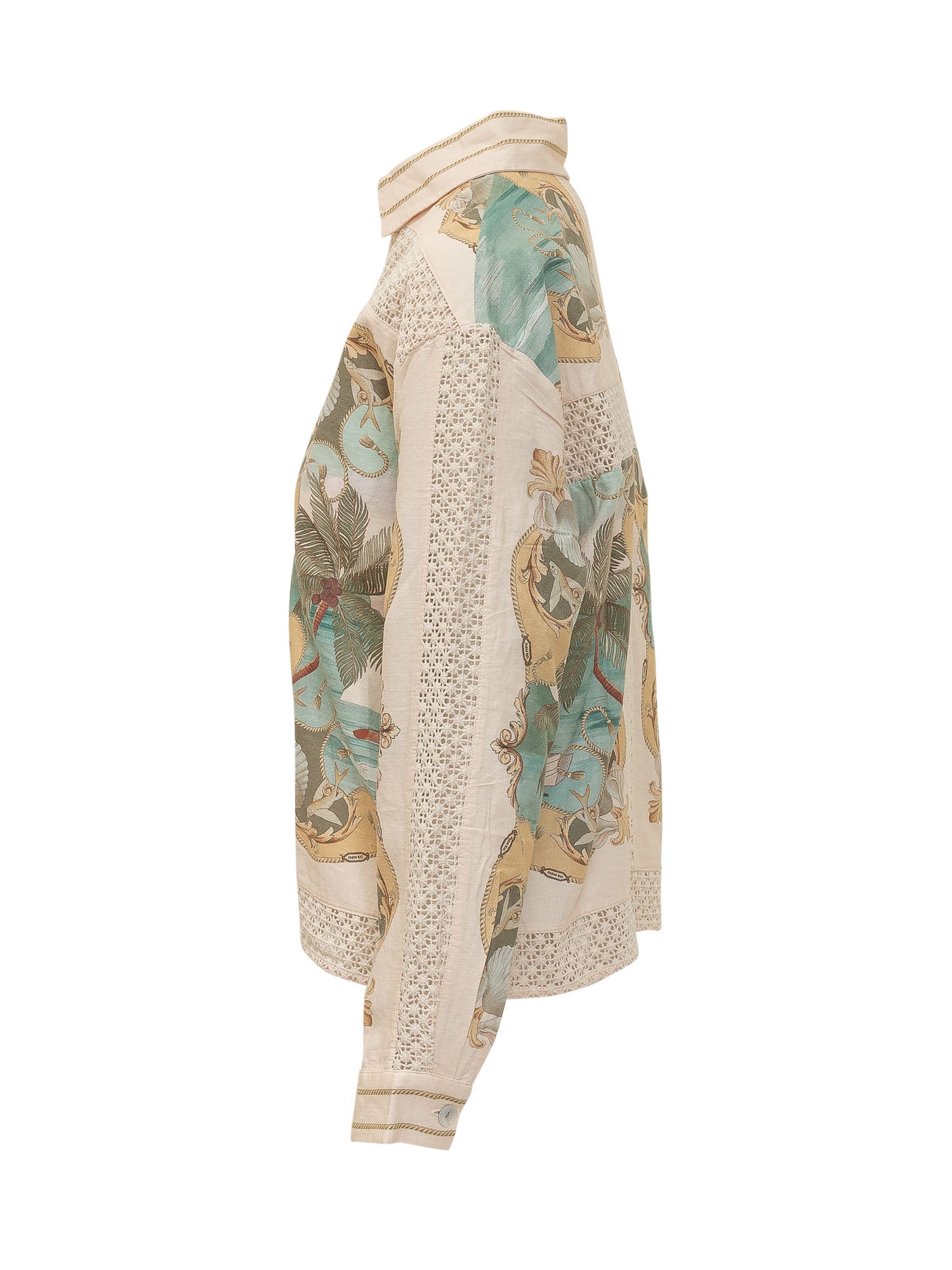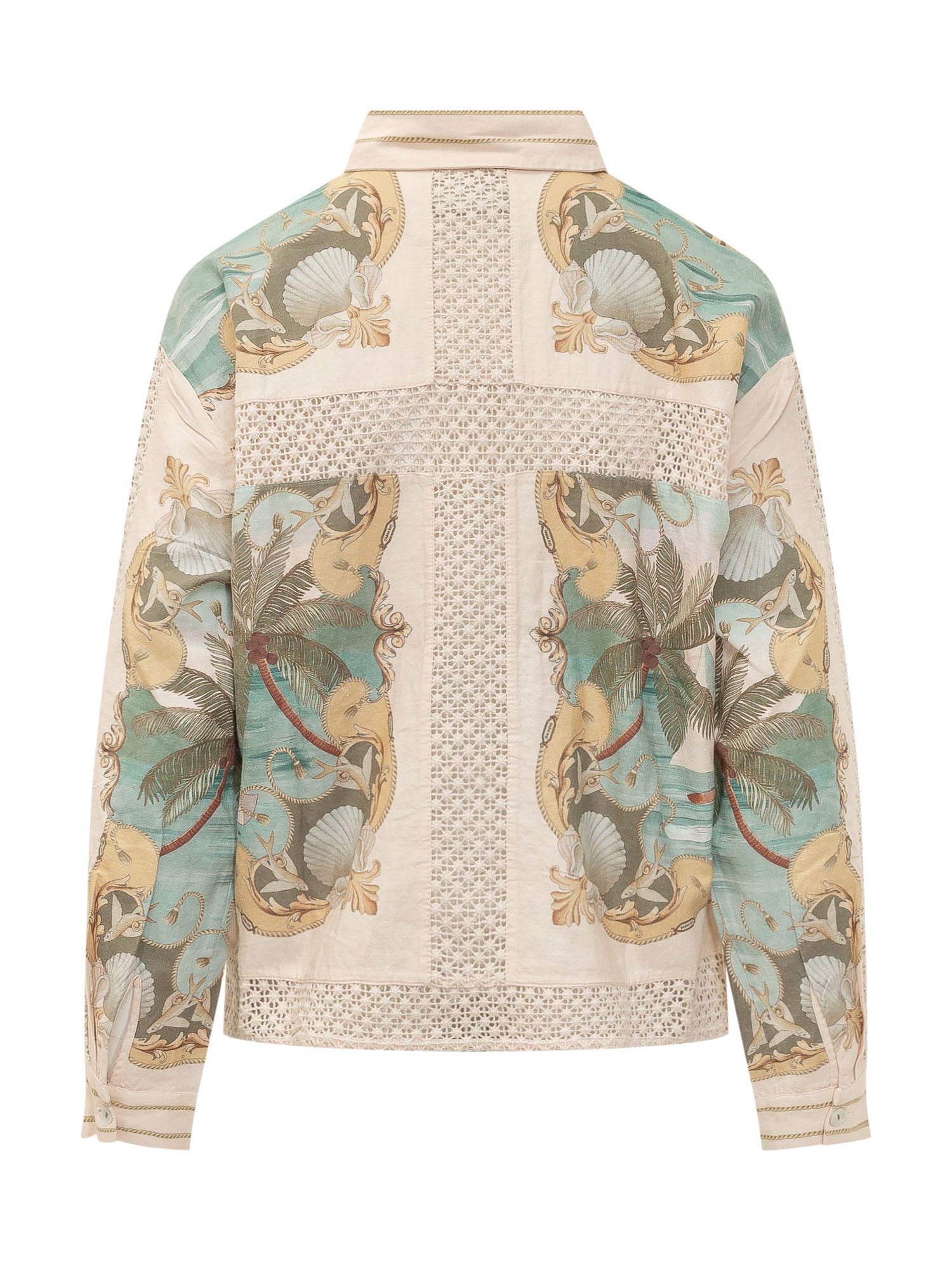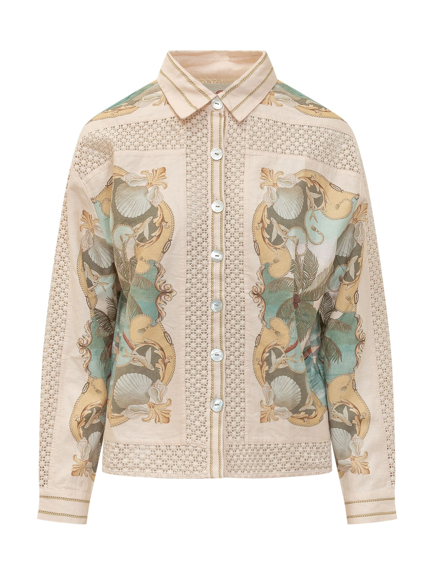 Camicia con colletto classico, maniche lunghe, chiusura con bottoni e inserti decorativi con stampa