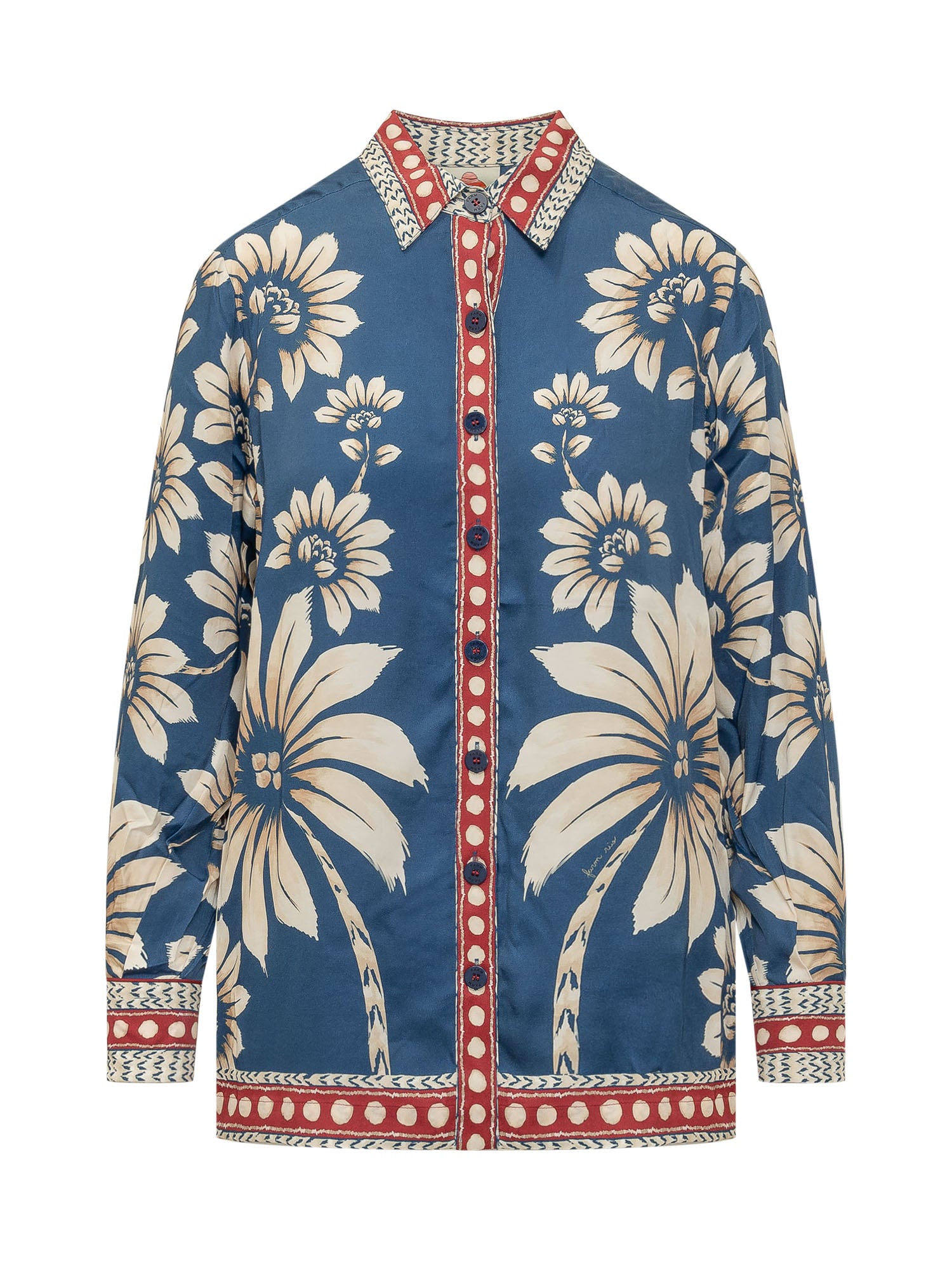 Camicia leggera con motivo floreale all over e profili stampati a contrasto. Colletto classico, chiusura frontale con bottoni e maniche lunghe. Vestibilità rilassata ispirata allo stile pijama.