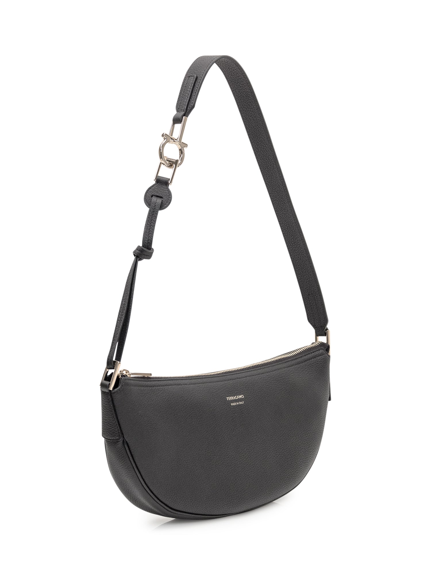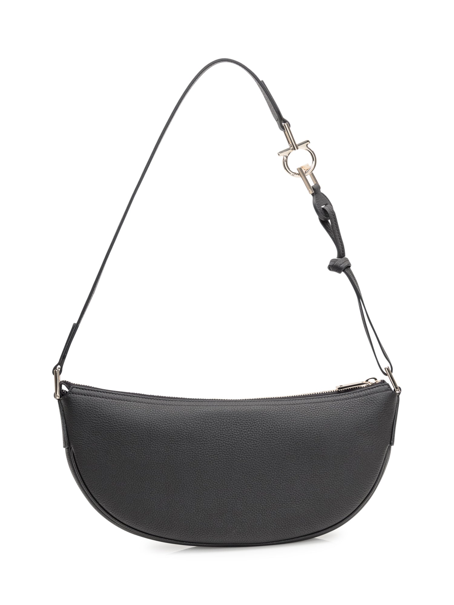 Borsa nera a mezzaluna con lavorazione in vitello bottalato e martellato. Apertura con zip metallica. Tracolla in pelle con moschettone