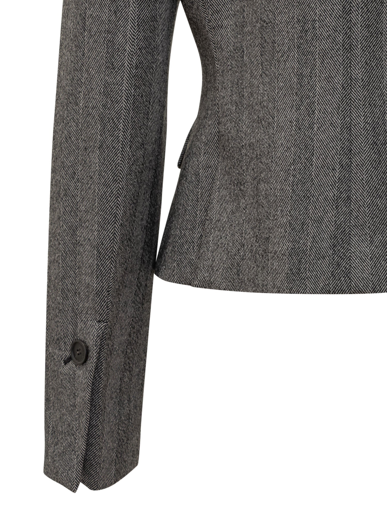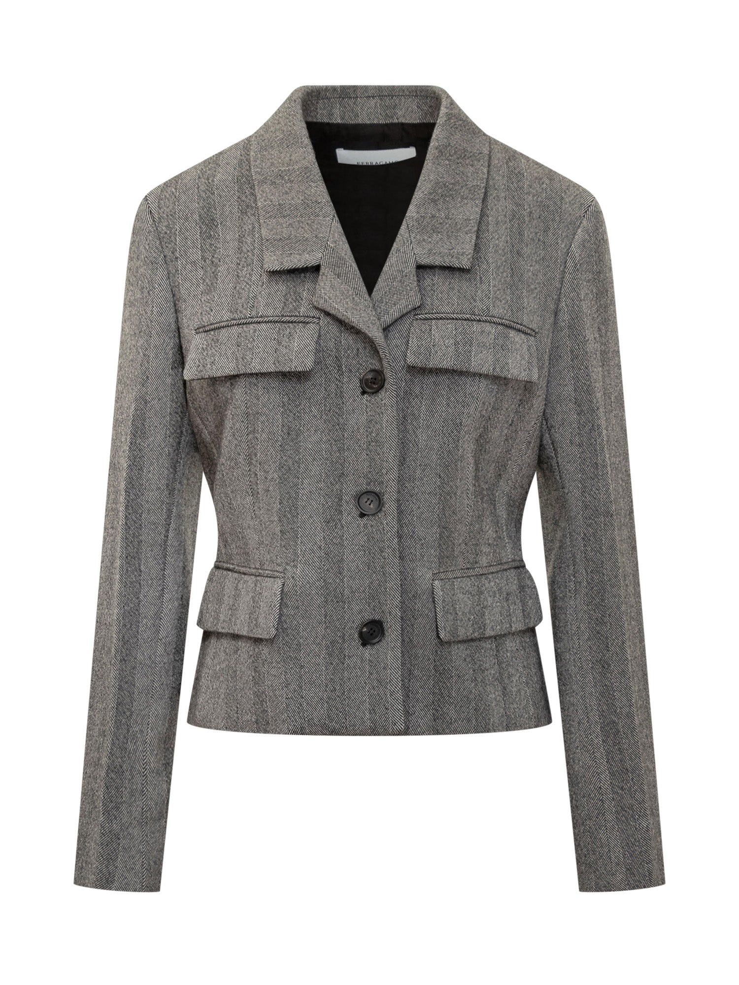 Giacca Ferragamo in lana grigia con motivo a spina di pesce. Taglio corto e dettagli a tasche per uno stile elegante e contemporaneo.
