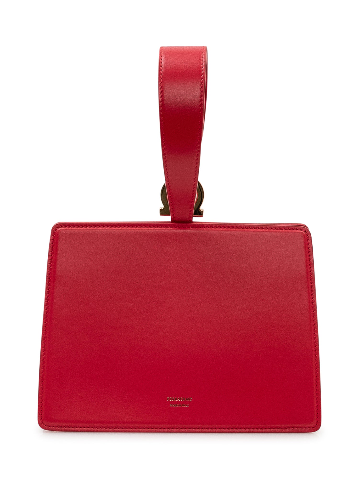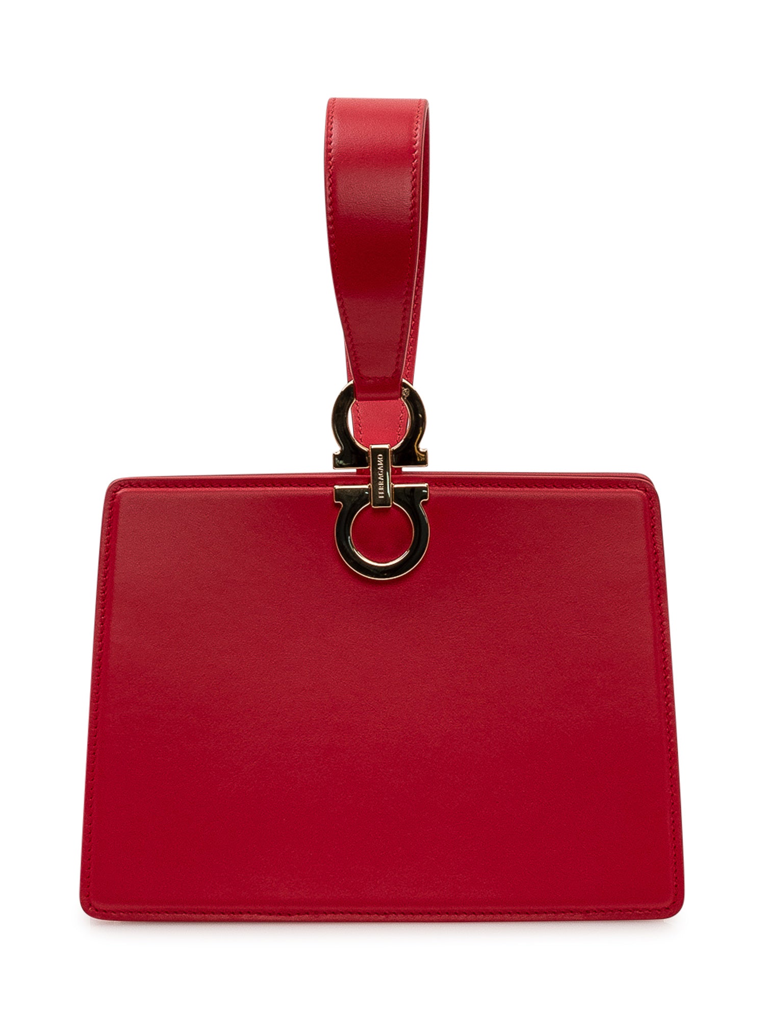 Pochette rettangolare in pelle lucida con gancio metallico superiore e cinturino da polso. Design compatto con bordi strutturati.