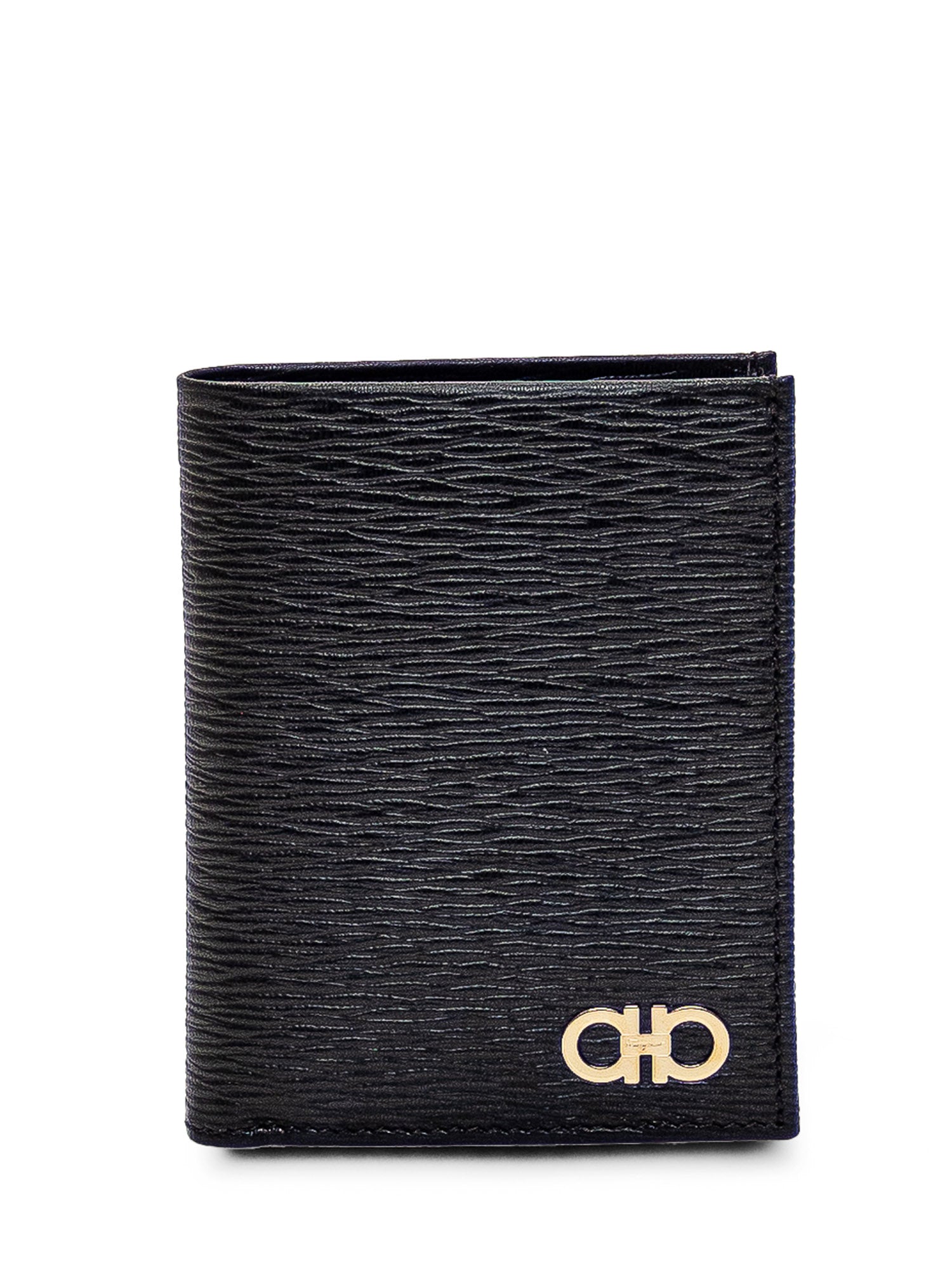 Portafoglio nero in pelle. Scomparti interni per carte di credito e banconote. Logo Gancini in metallo sul davanti.