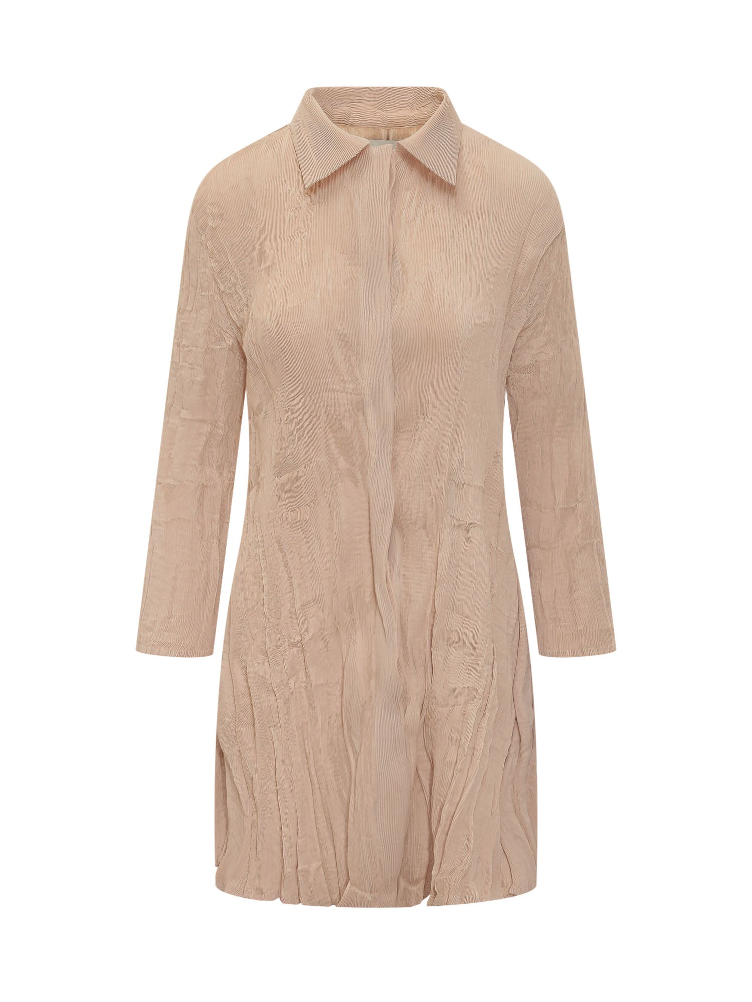 Abito con colletto classico, maniche lunghe e chiusura frontale con bottoni, struttura plissettata