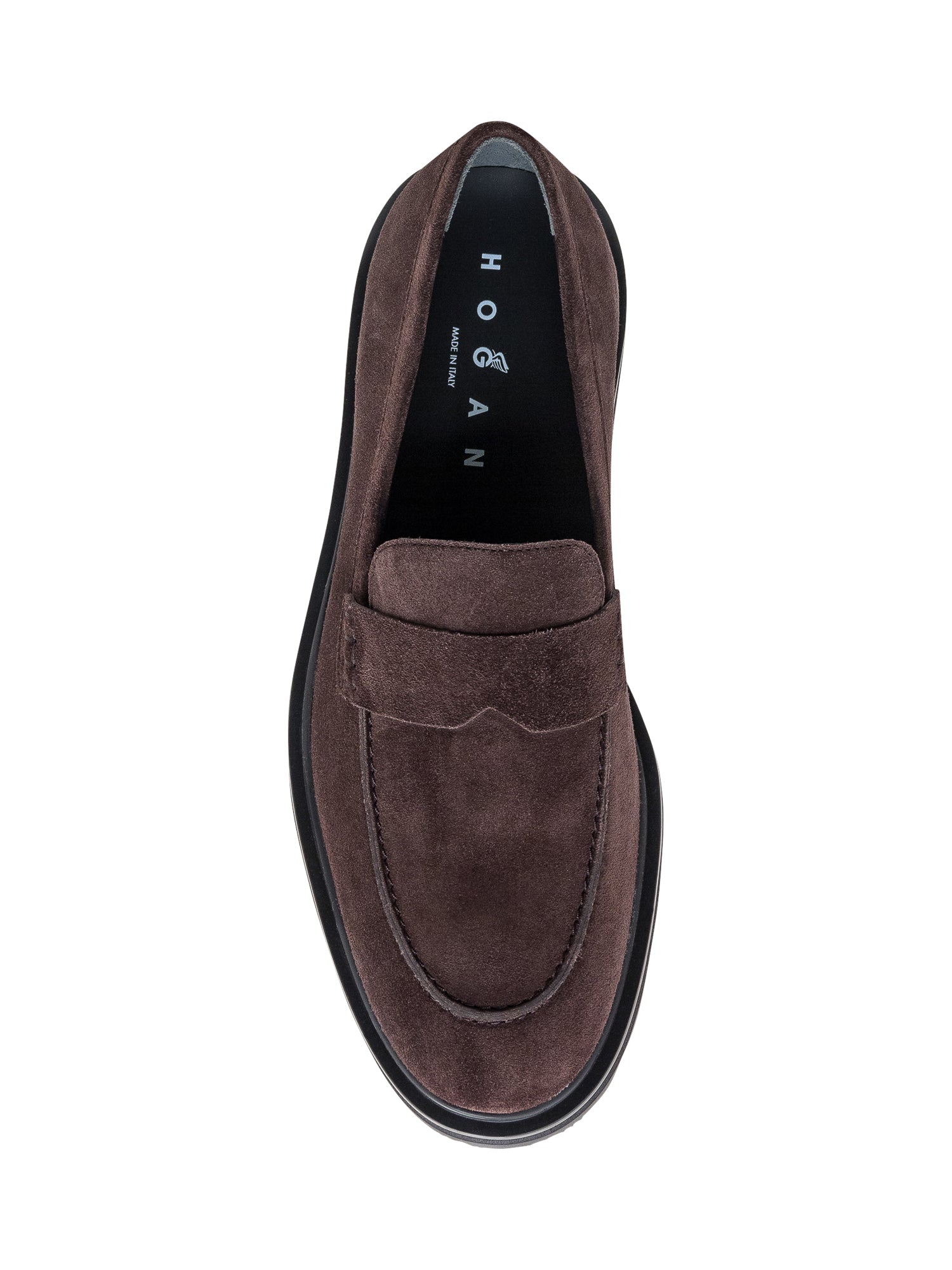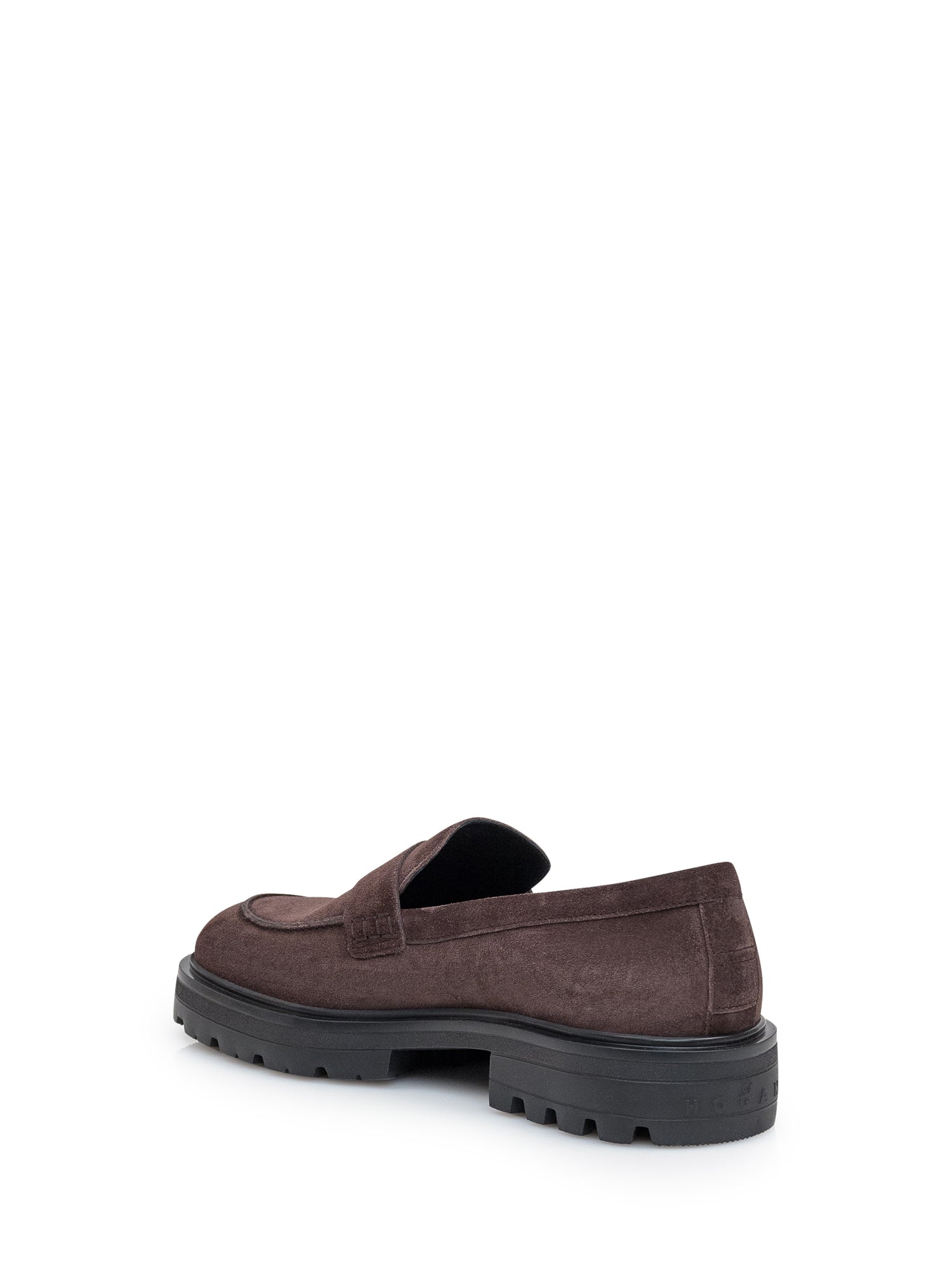 Mocassino marrone in pelle scamosciata. Suola sagomata. Logo in rilievo sul retro.