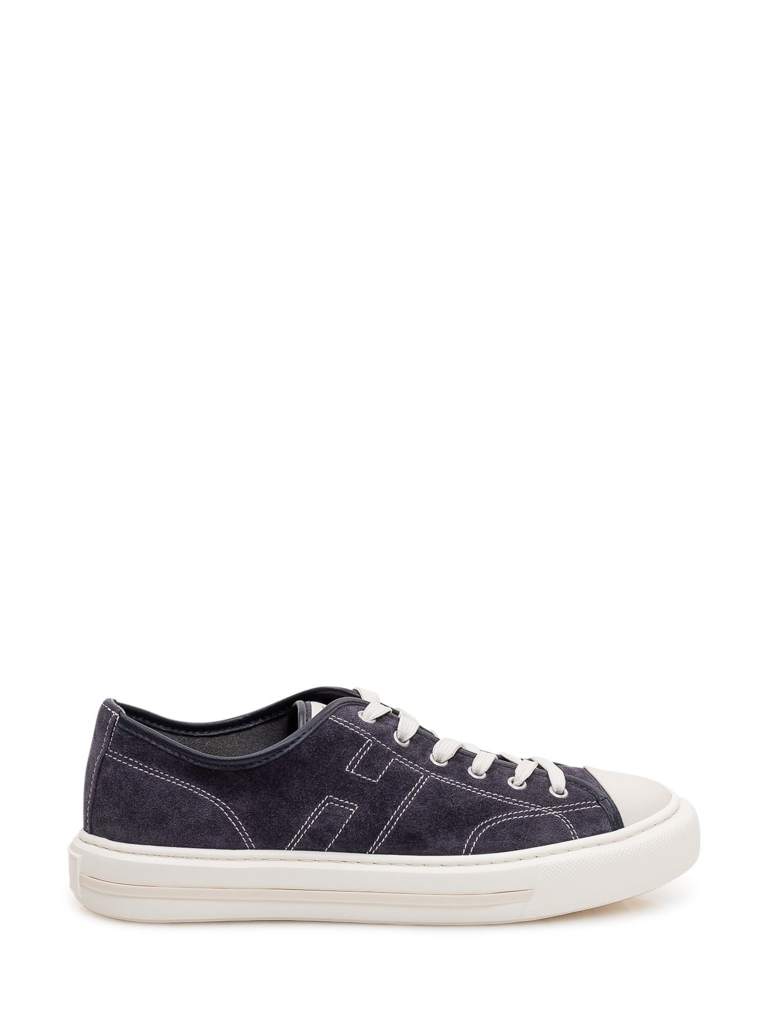Sneakers con allacciatura frontale e tomaia in suede con cuciture a vista. Dettaglio laterale a H e suola in gomma. Design essenziale per uso quotidiano.