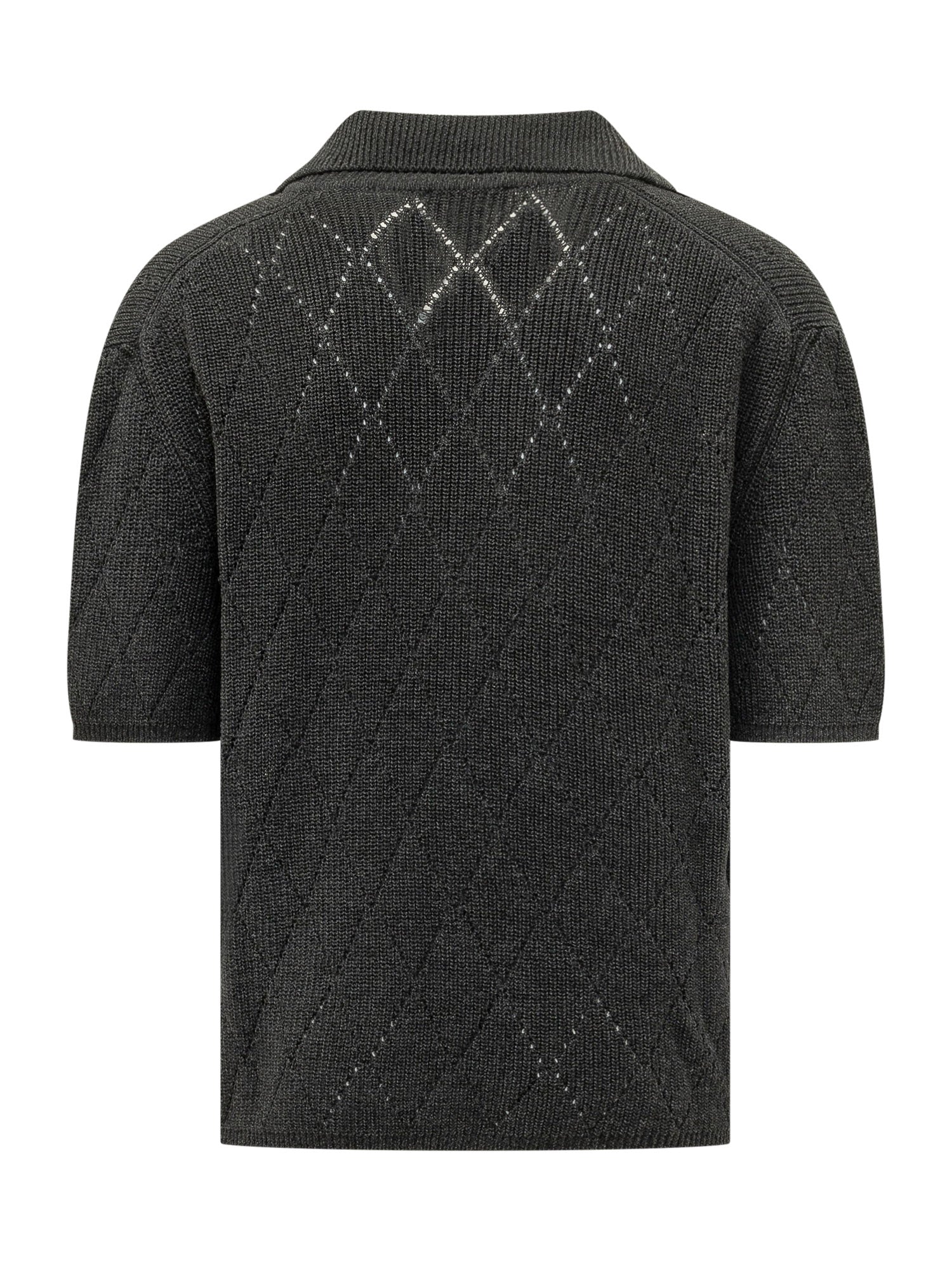 Camicia in maglia a maniche corte in tonalità nera, caratterizzata da una raffinata lavorazione traforata con motivo geometrico tono su tono. Realizzata in filato leggero, presenta colletto classico, chiusura frontale con bottoni e finiture a costine. La texture delicatamente trasparente dona profondità e un eleganza contemporanea, rendendola ideale per look estivi sofisticati.