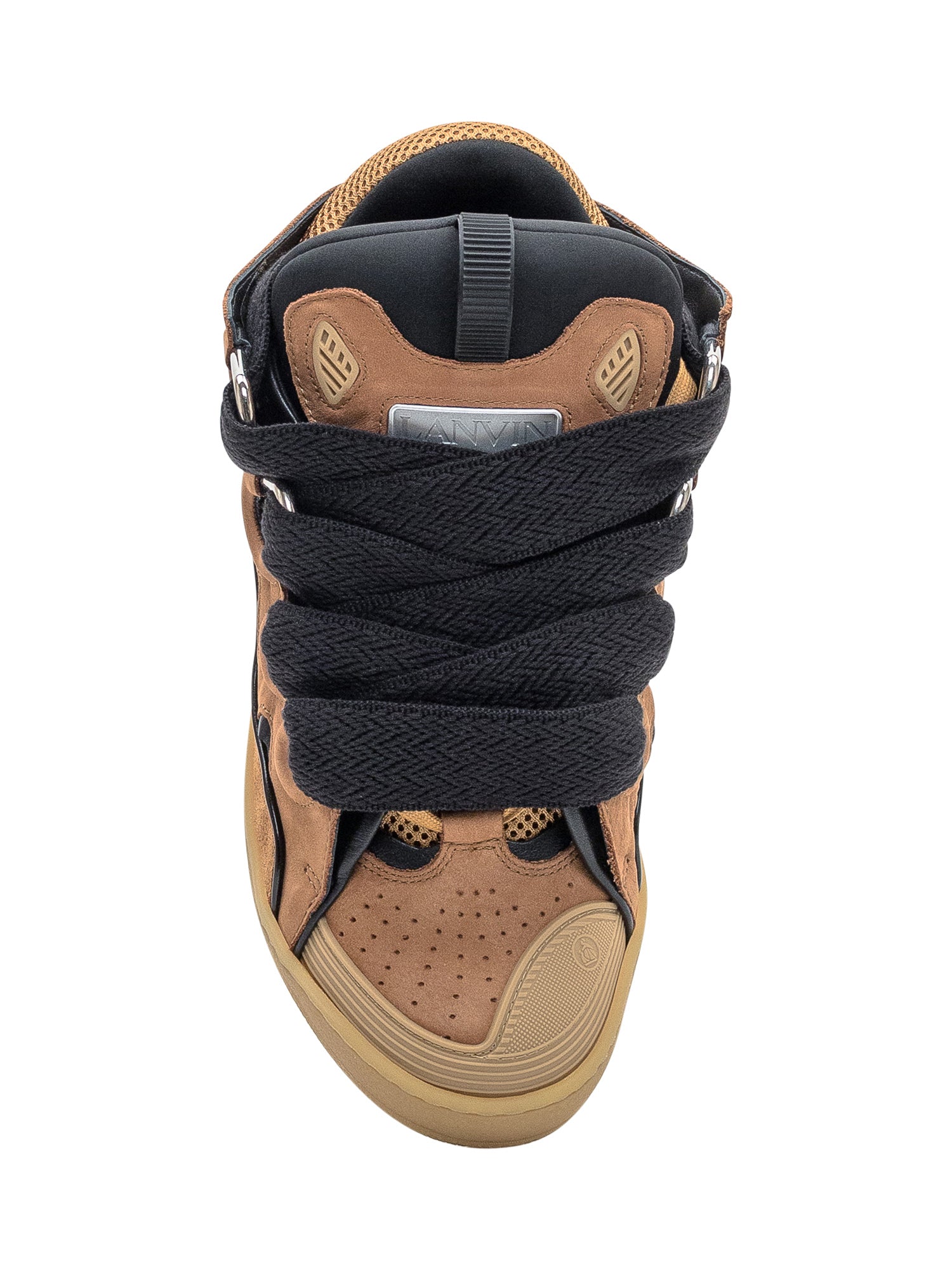 Sneakers Lanvin Curb in pelle e mesh marroni con dettagli neri, maxi lacci in cotone e suola in gomma beige.
