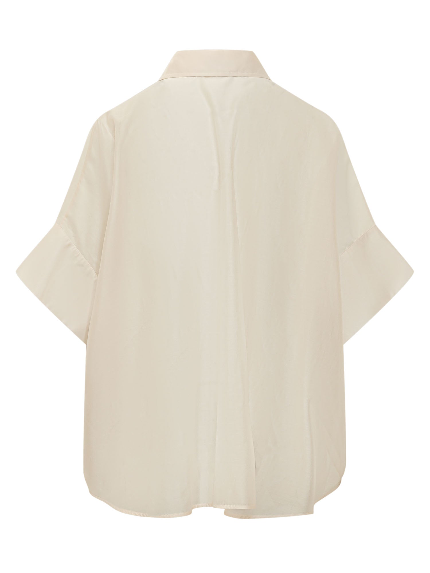Camicia ampia a maniche corte con colletto classico, tasche frontali con patta e chiusura con bottoni