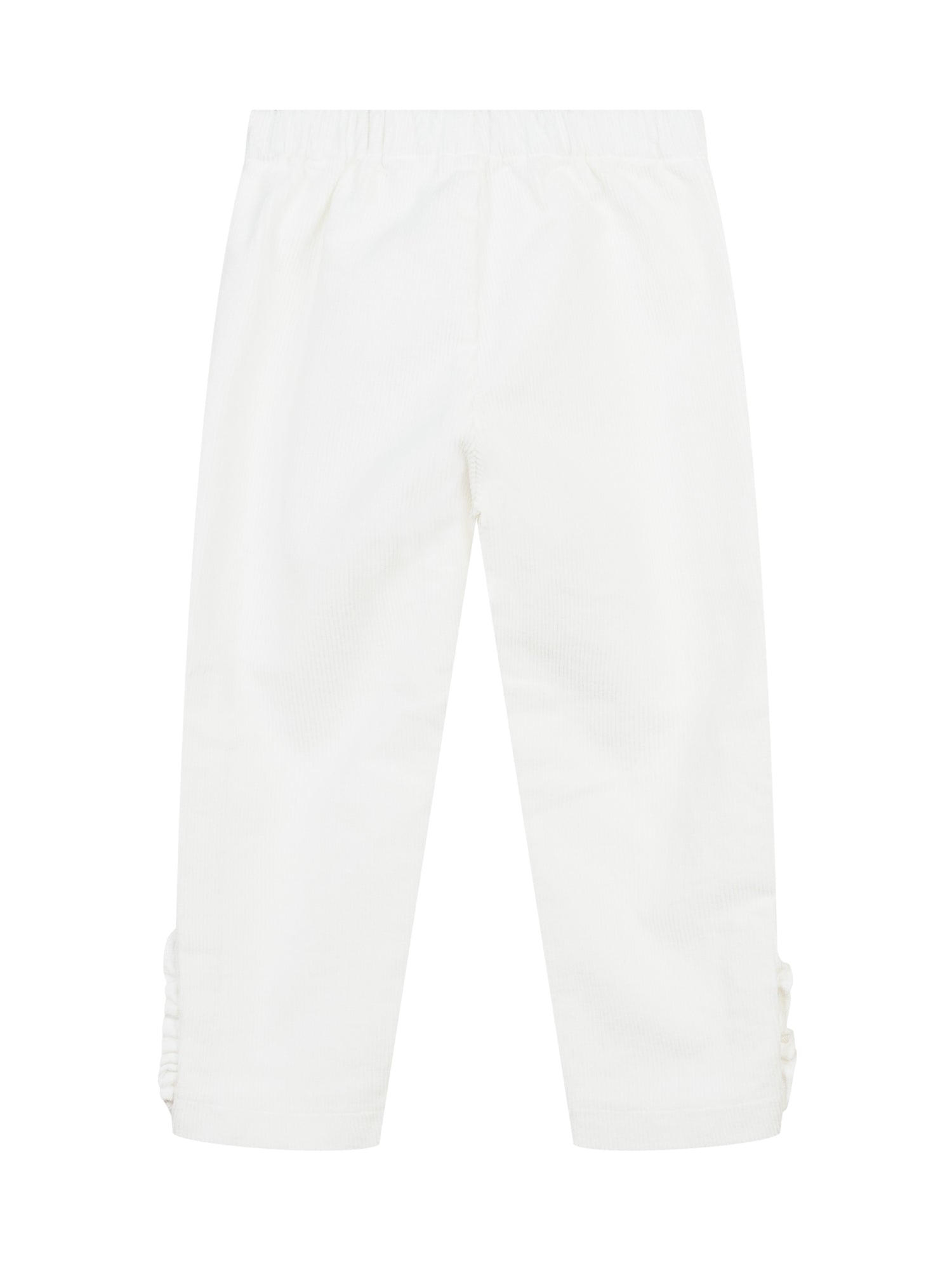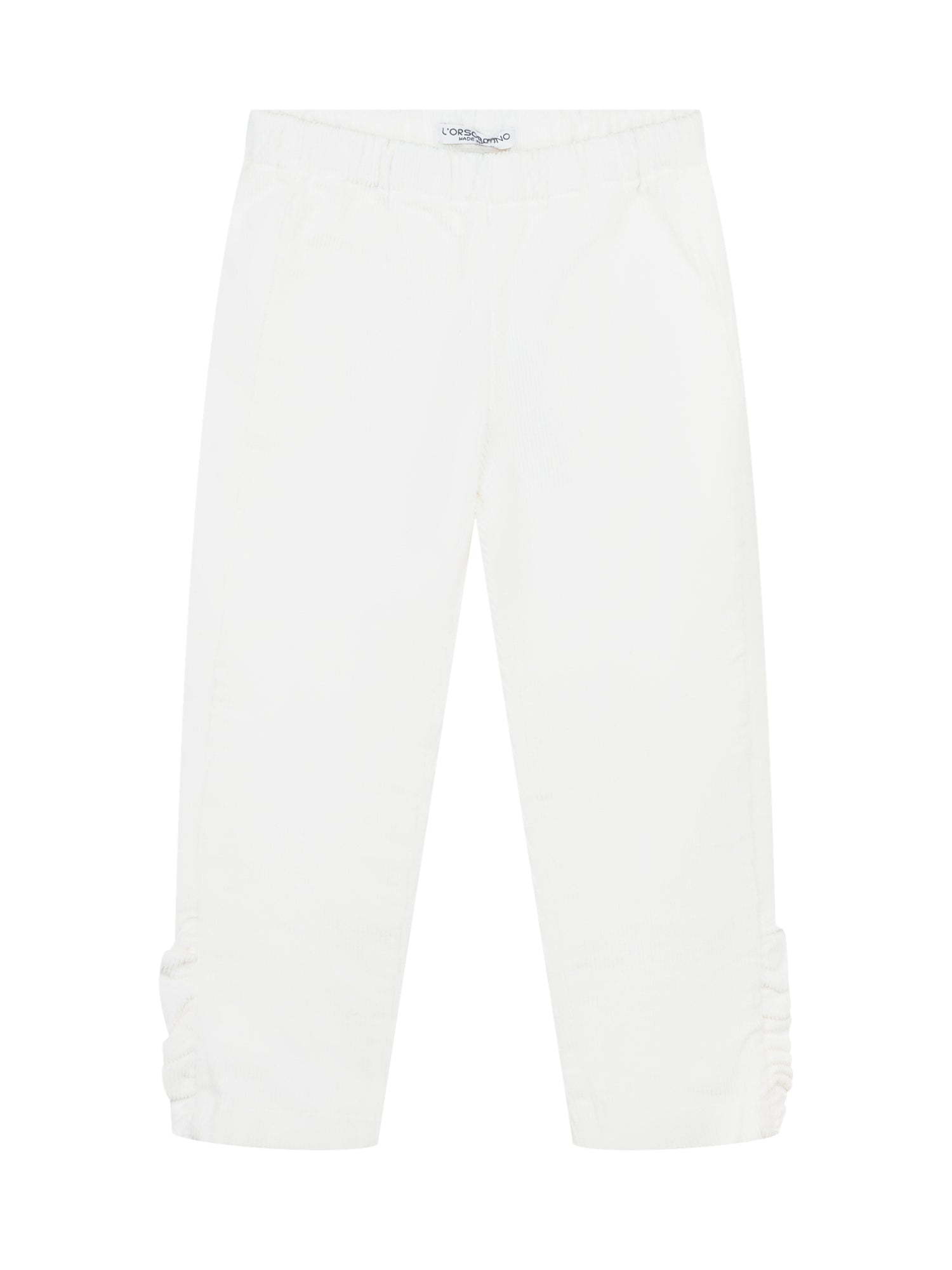 Pantaloni L Orso Bruno in velluto a coste bianchi, con vita elastica e dettagli arricciati alle caviglie.