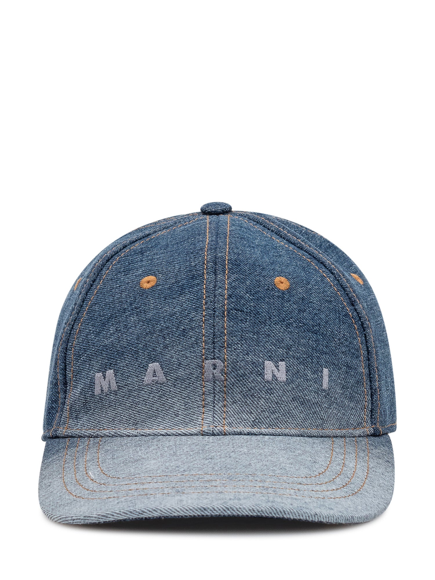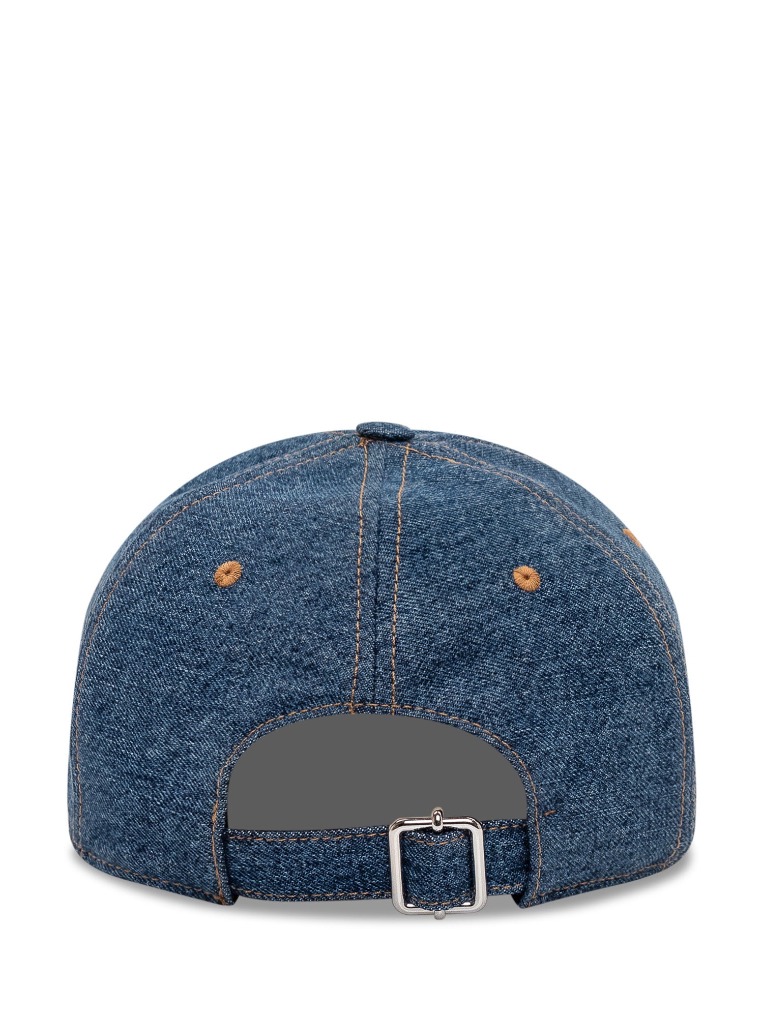 Cappello in denim con visiera curva e pannelli cuciti, fori di aerazione superiori e logo ricamato frontale. Struttura regolabile ideale per completare look casual.