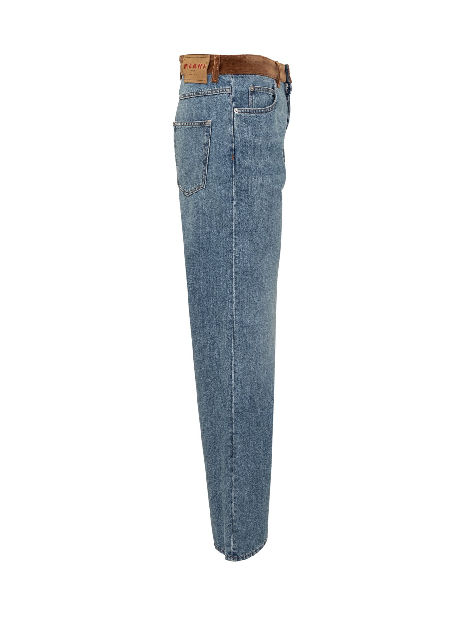 Chiusura con bottone e zip. Jeans Marni in denim blu con vita media e dettaglio in suede marrone sul cinturino.