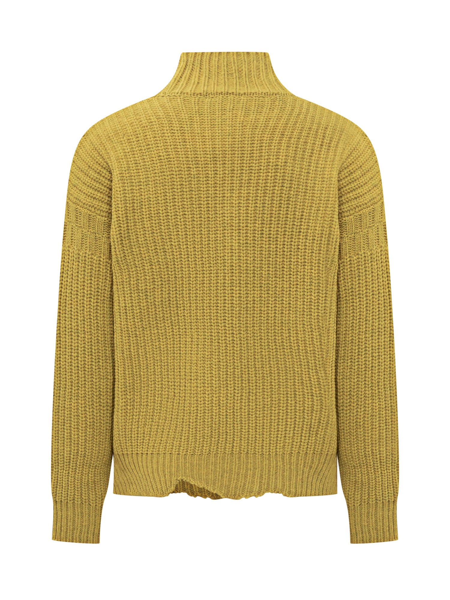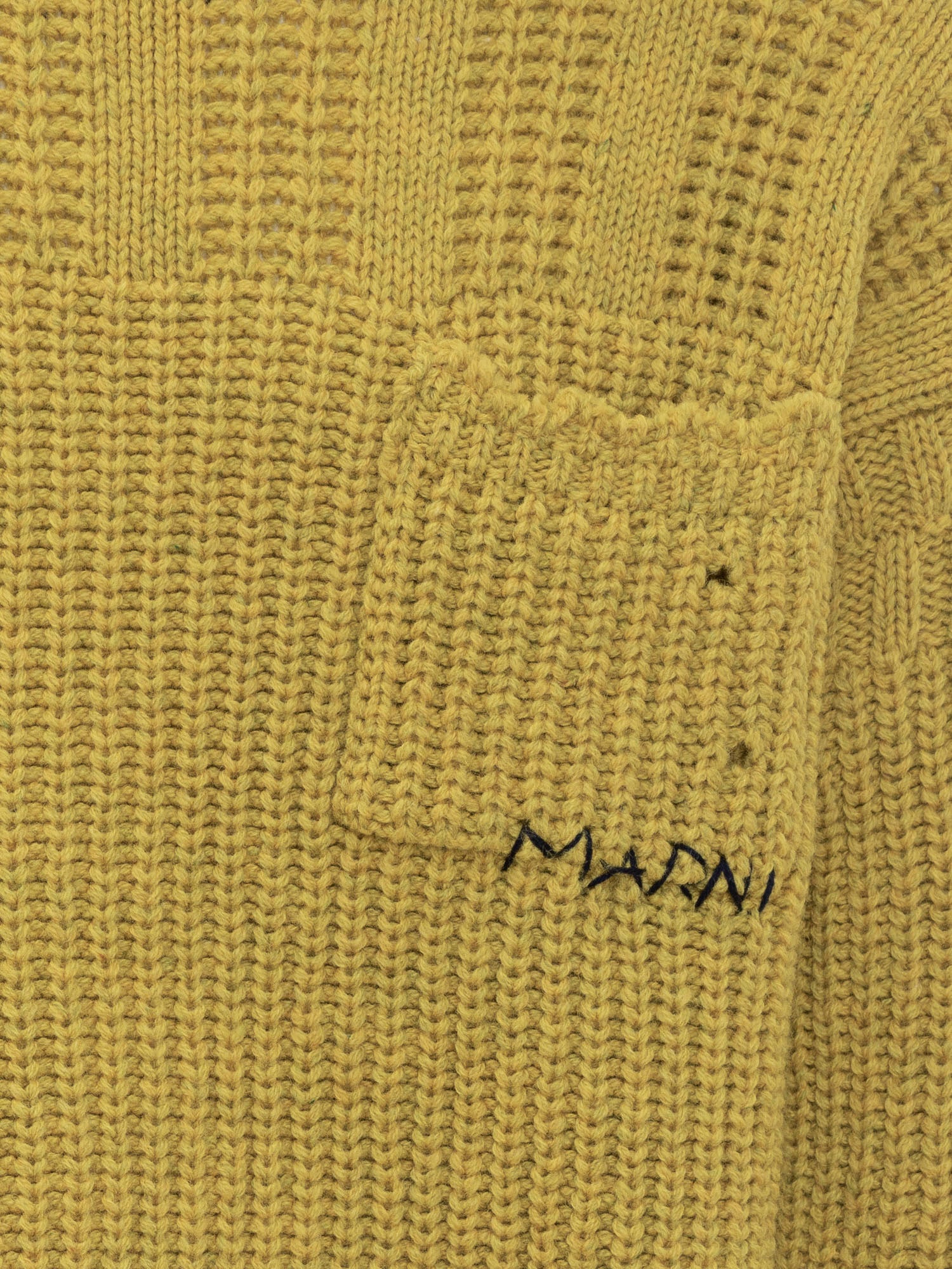 Collo alto. Lavorazione a maglia. Orlo con rotture. Taschino sul petto con logo ricamato.