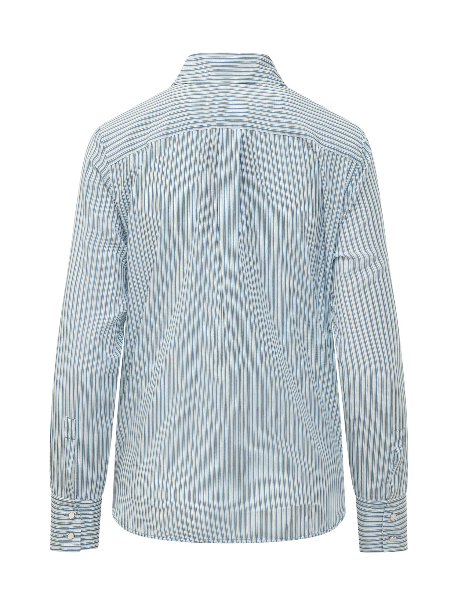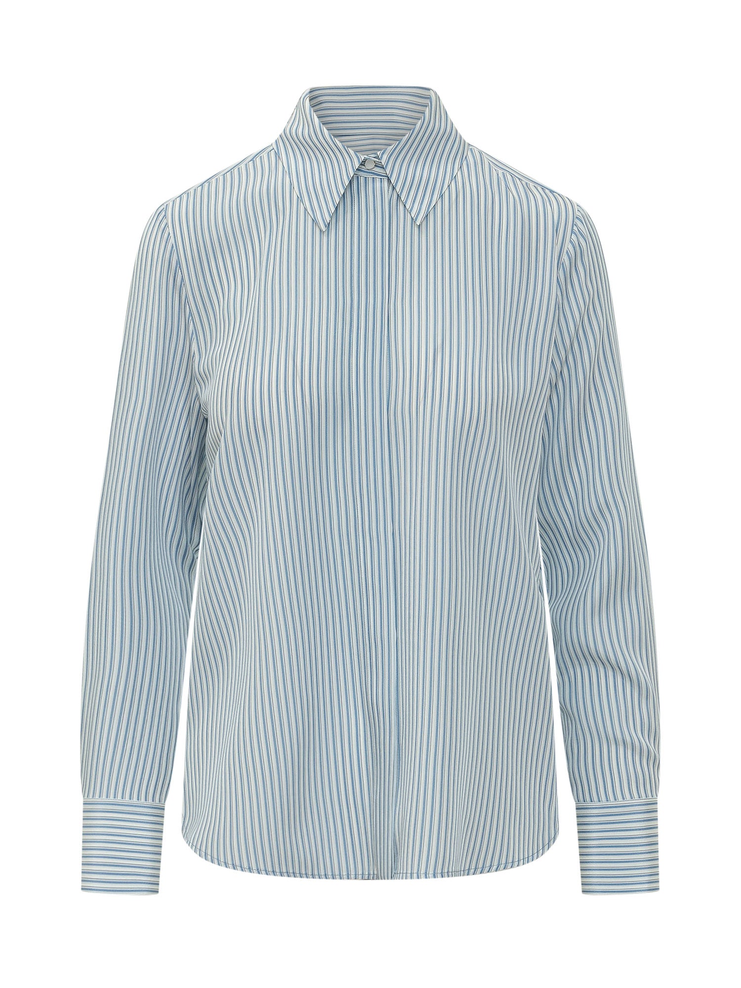 Camicia con colletto classico e chiusura frontale con bottoni nascosti. Modello a maniche lunghe con poini alti e motivo a righe verticali. Linea dritta ideale per look eleganti e contemporanei.