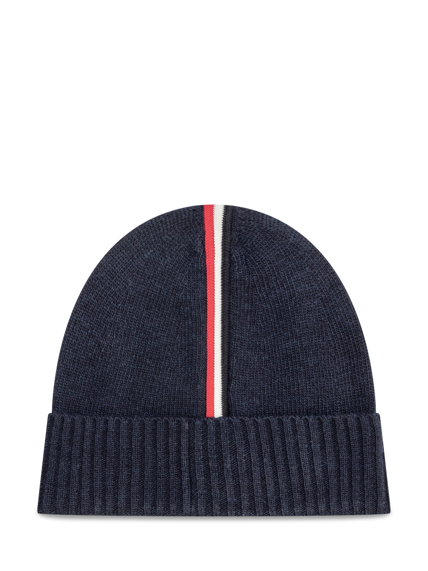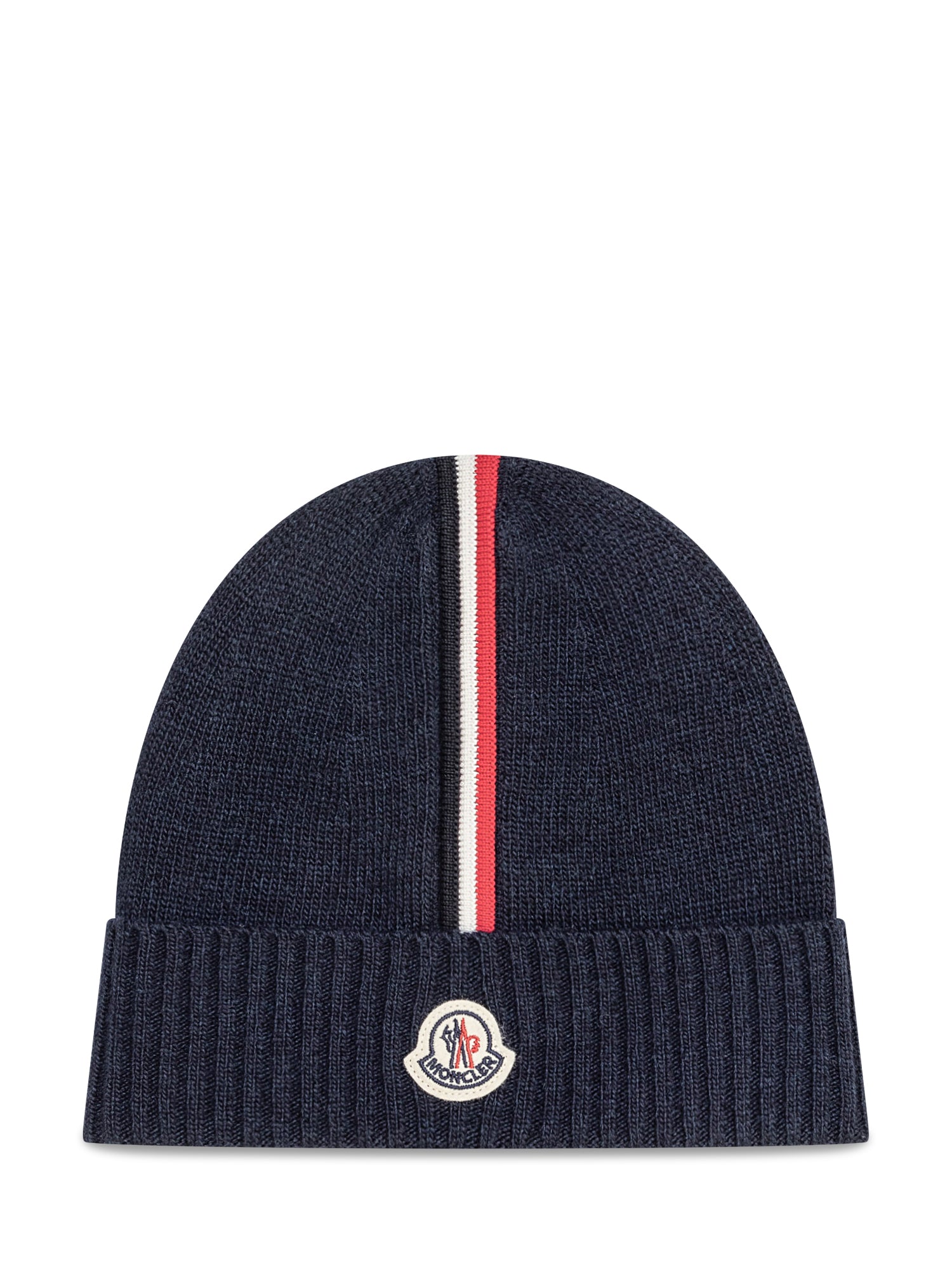 Cappello Moncler da bambino in maglia blu con risvolto, impreziosito dalla banda tricolore verticale e dal logo ricamato sul fronte.