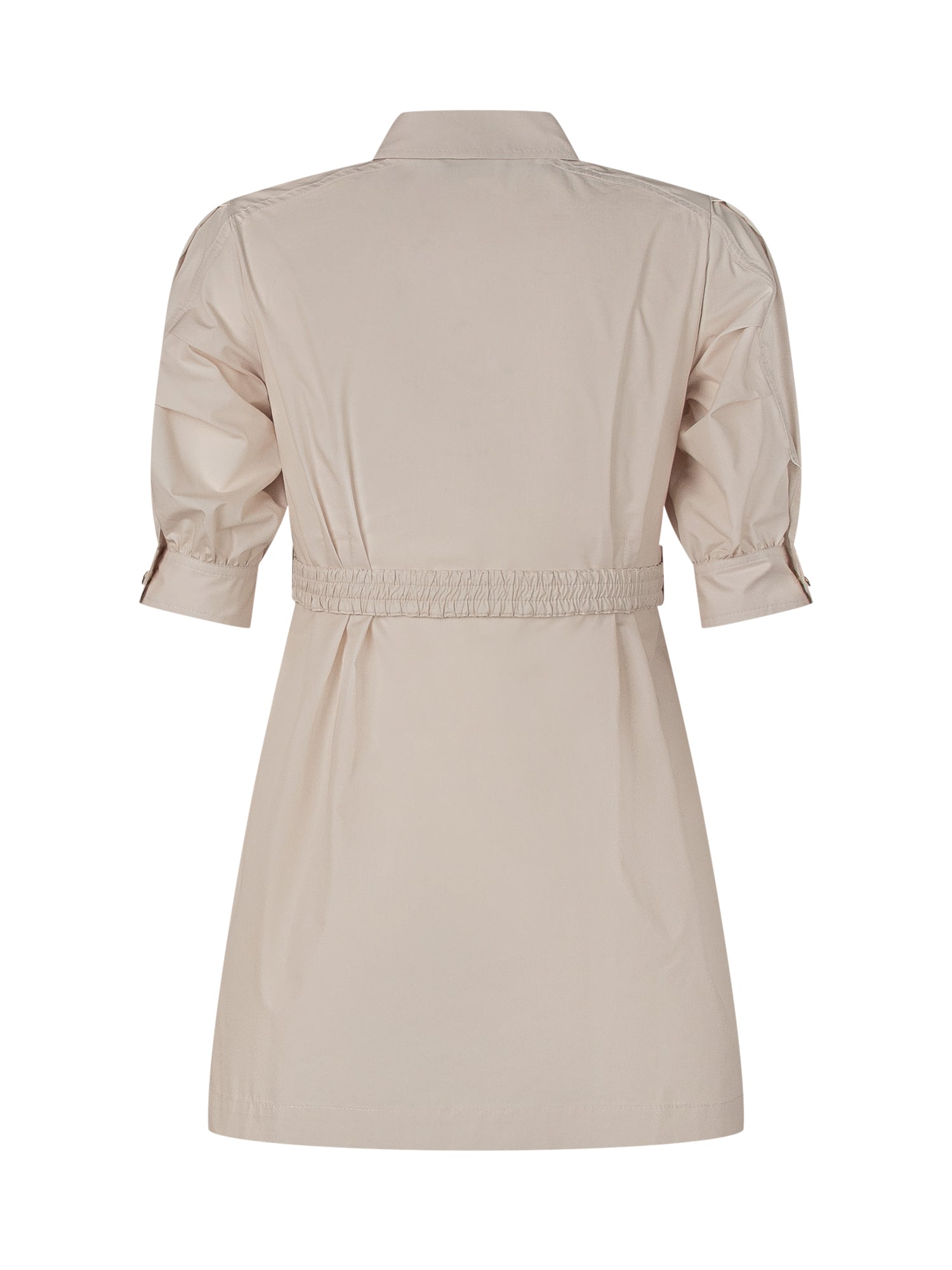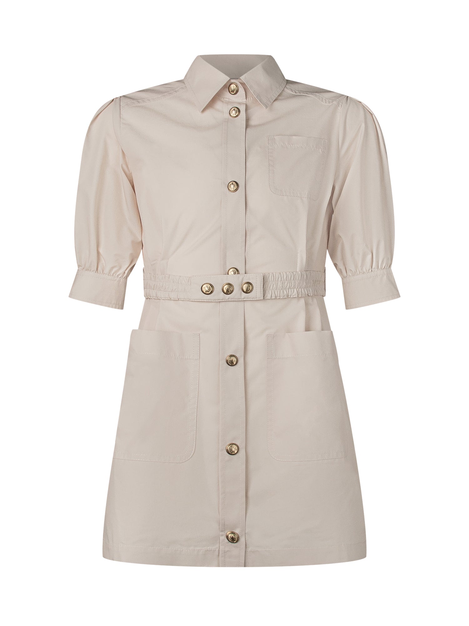 Chiusura con con bottoni. Tasche applicate. Cintura. Colletto a camicia.