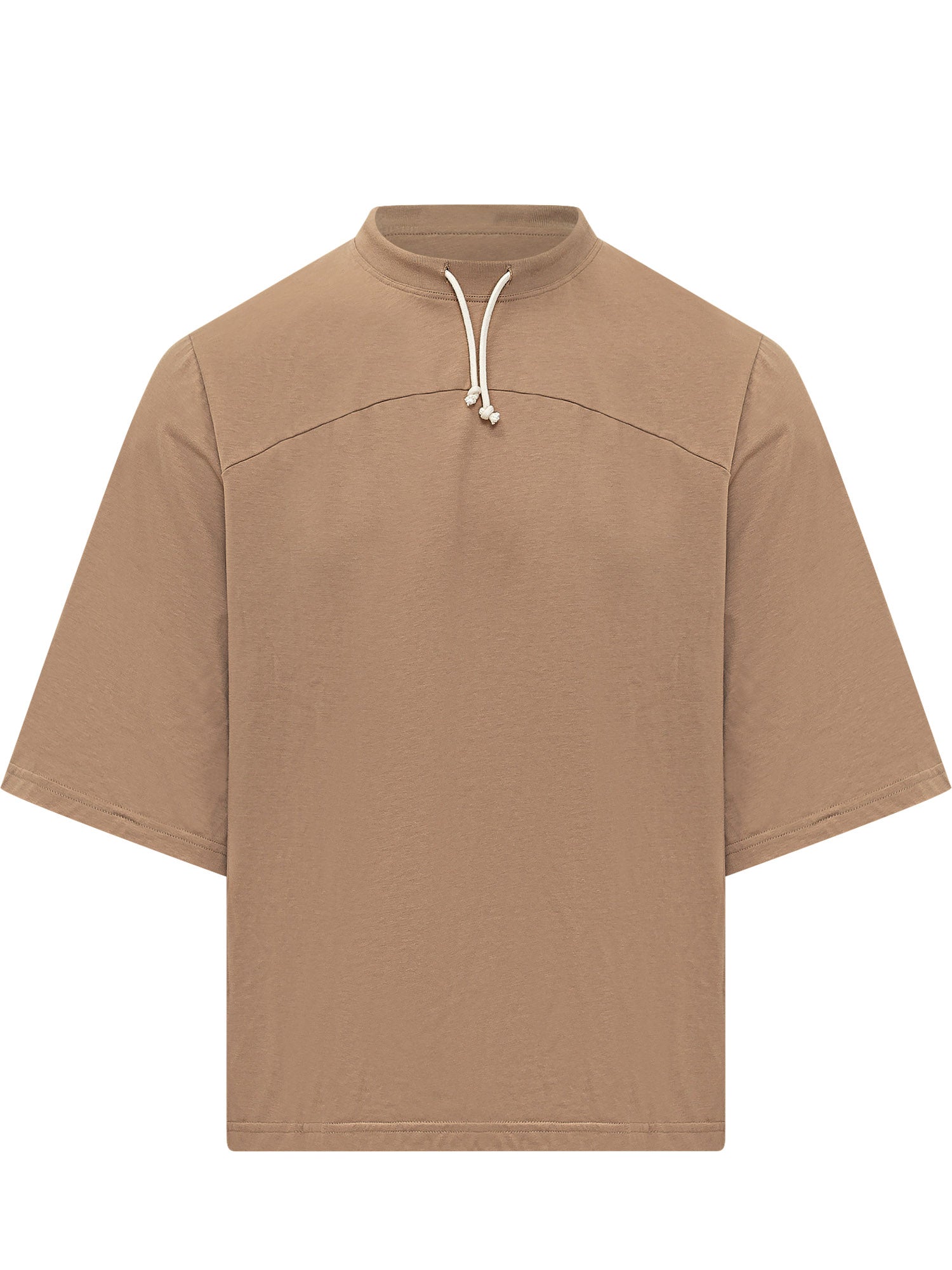 T-shirt con maniche corte e collo con coulisse regolabile. Design con cucitura orizzontale sul petto e linea ampia. Ideale per uno stile contemporaneo e ricercato.