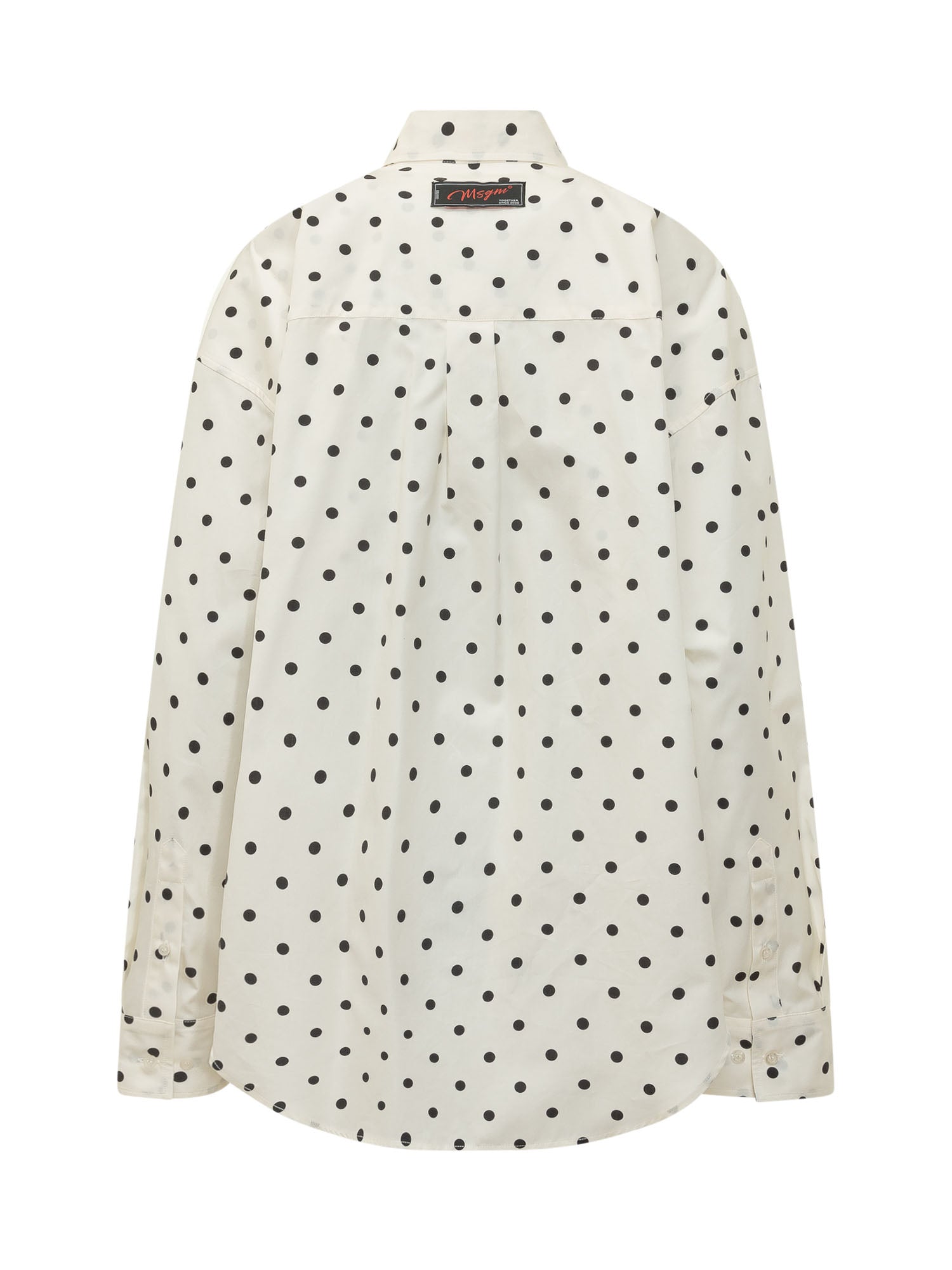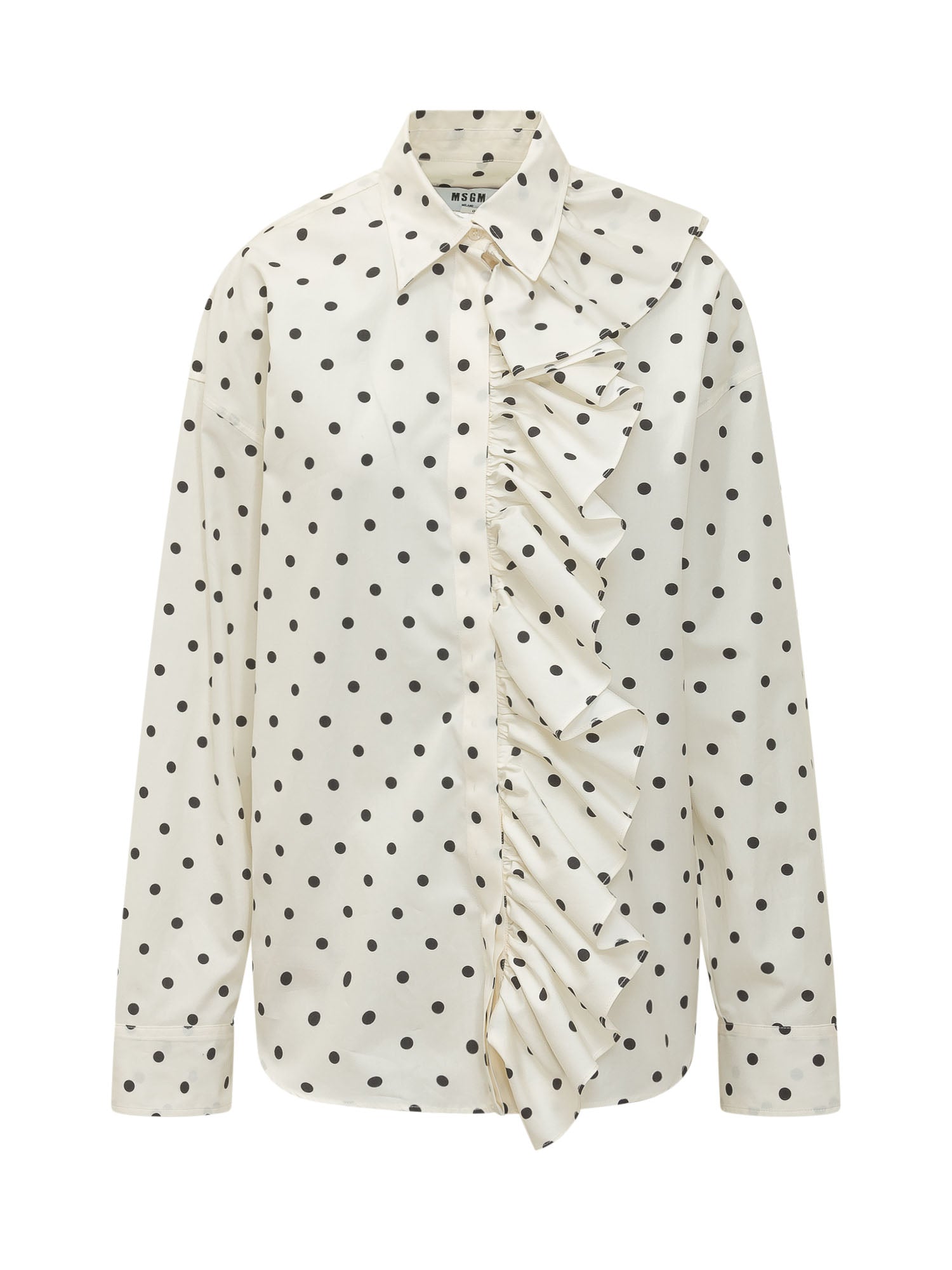 Camicia a maniche lunghe realizzata in tessuto leggero con stampa a pois all-over. Il modello presenta colletto classico, chiusura frontale con bottoni e dettaglio di rouches verticali sul davanti che aggiungono movimento e carattere al design. Polsini con bottone per una finitura elegante.