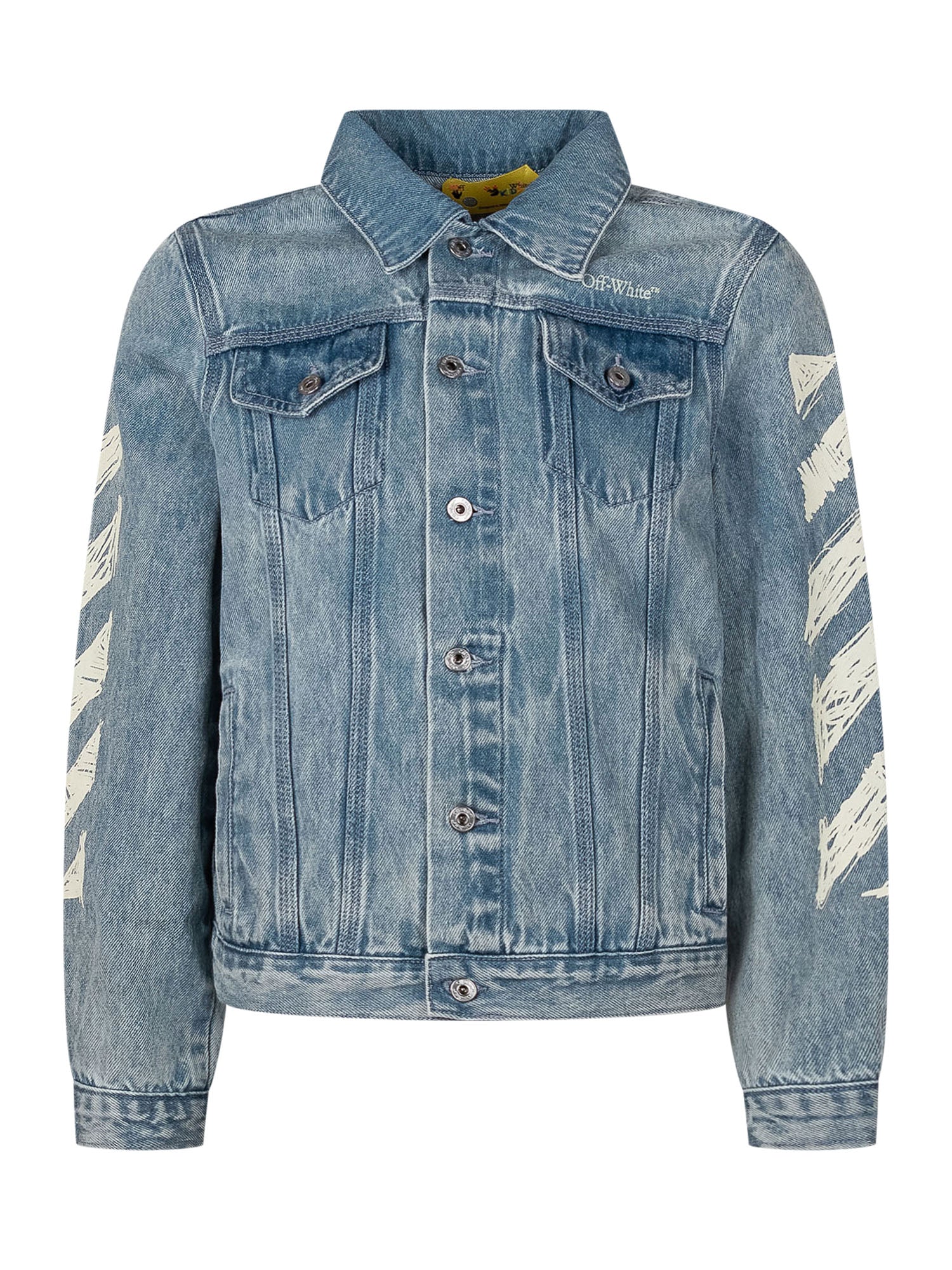Giacca in denim con lavaggio chiaro, dettagli grafici diagonali sulle maniche e logo Off-White, design iconico e vestibilità moderna