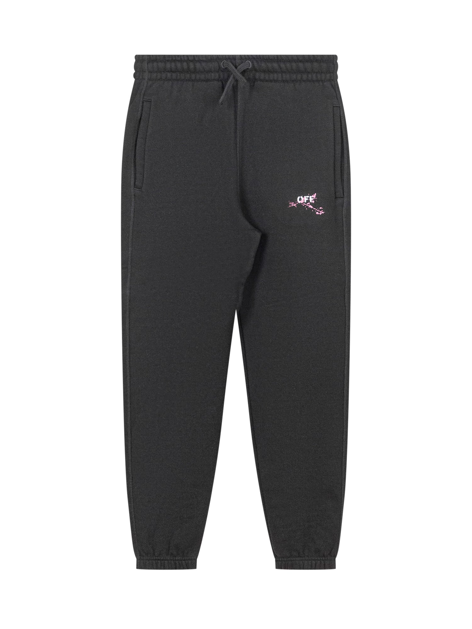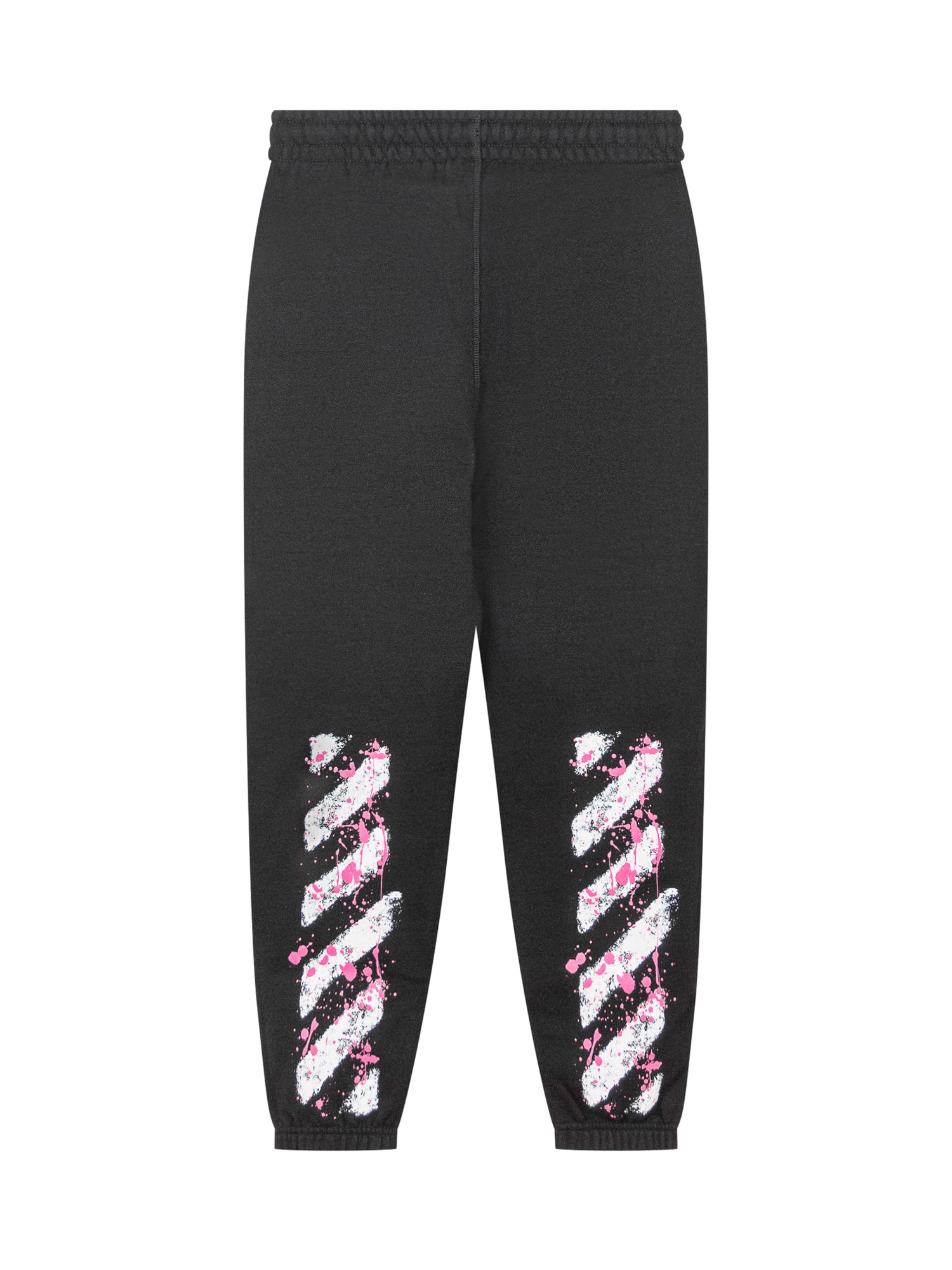 Pantaloni jogger Off-White in cotone nero con elastico in vita, logo frontale e iconiche righe diagonali sul retro arricchite da schizzi rosa.