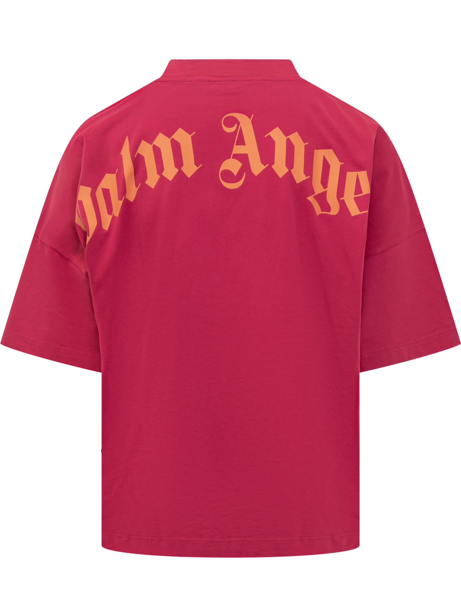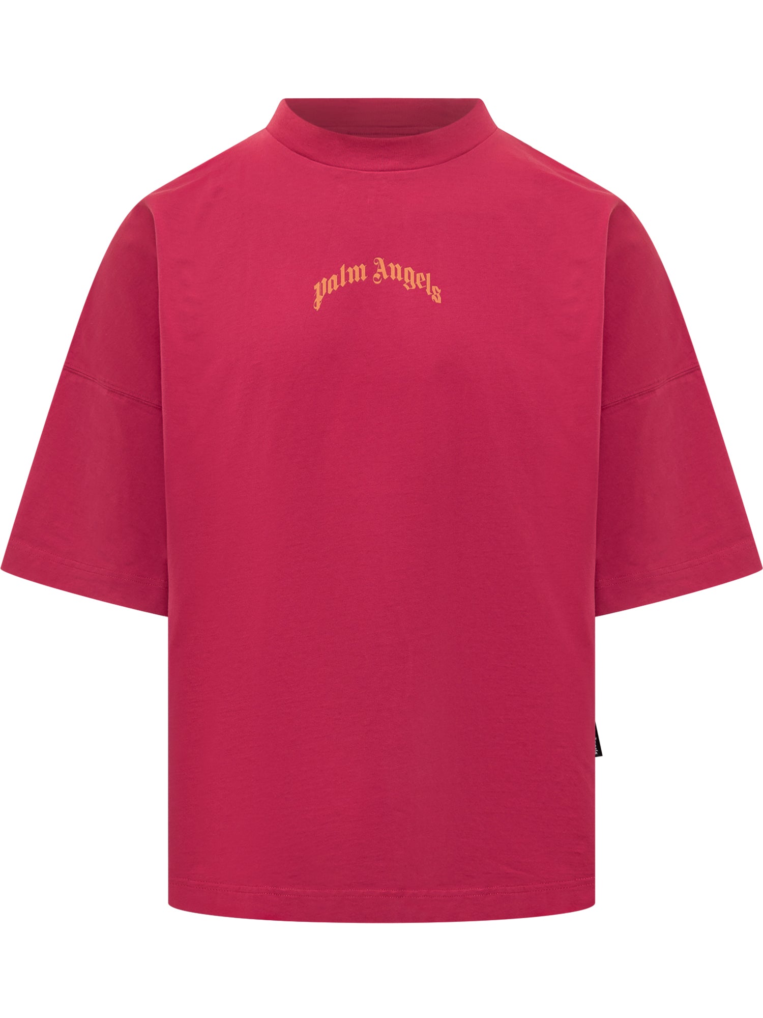 T-shirt Palm Angels in cotone rosso con logo giallo sul petto. Vestibilità oversize e collo alto a costine.