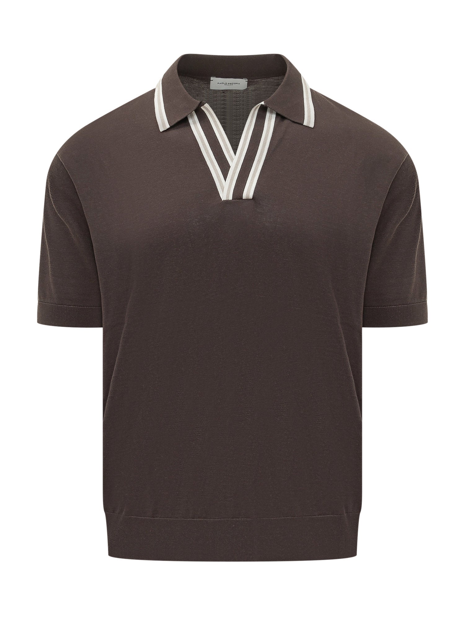 Polo a maniche corte con colletto classico e apertura a V senza bottoni, impreziosita da dettagli a righe a contrasto su colletto e scollo. Modello con finiture a costine su maniche e fondo, dalla vestibilità regolare per un look raffinato e contemporaneo.