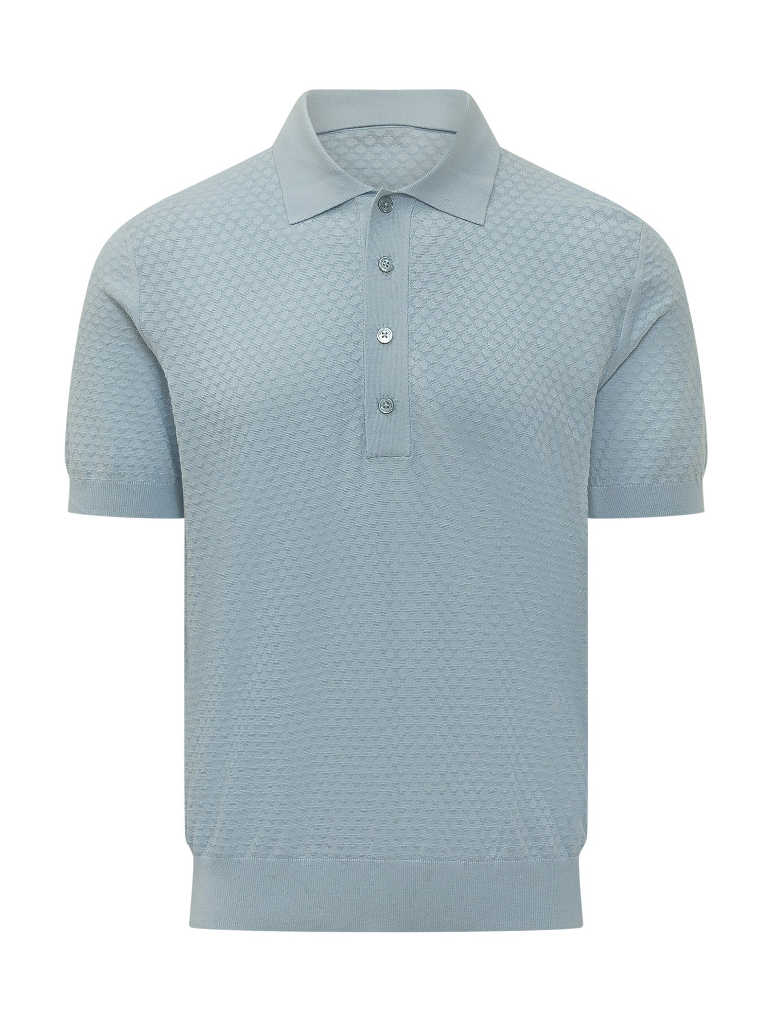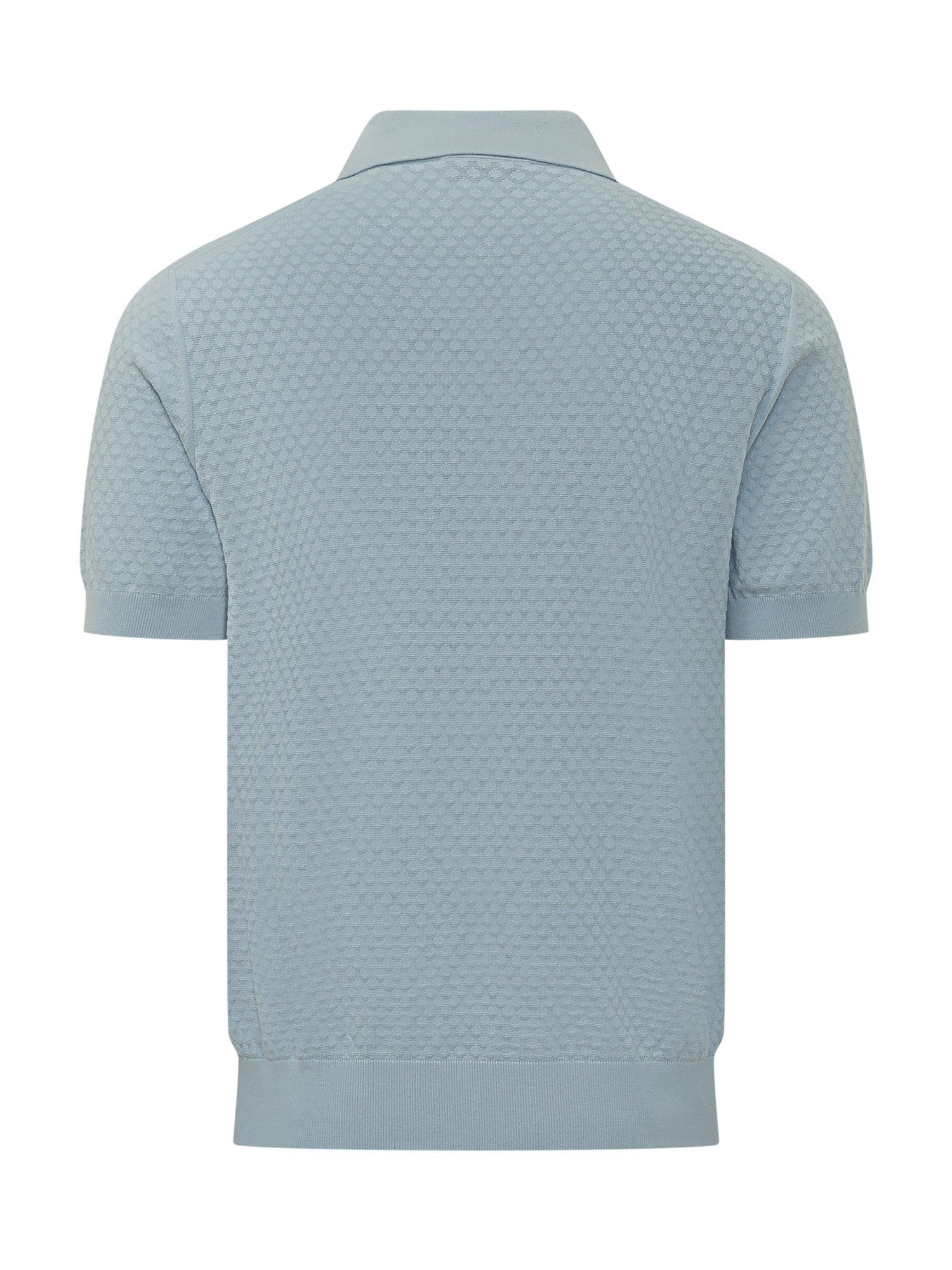 Polo a maniche corte con colletto classico e chiusura frontale con bottoni. Modello realizzato in maglia con motivo geometrico tono su tono all-over, rifinito con bordi a costine su maniche e fondo. Vestibilità regolare per uno stile raffinato e contemporaneo.