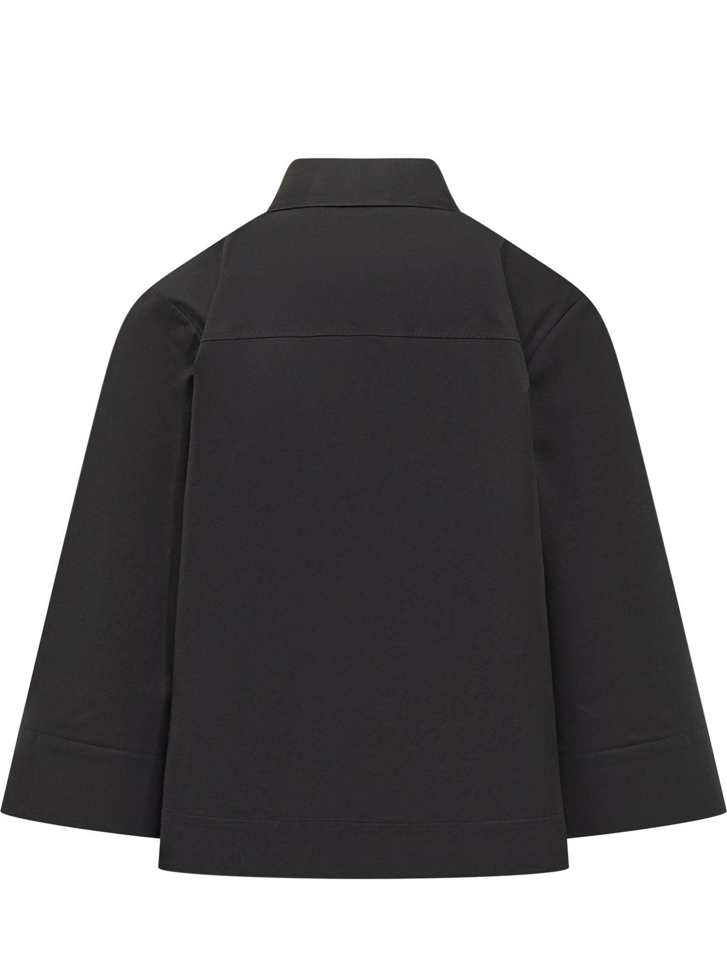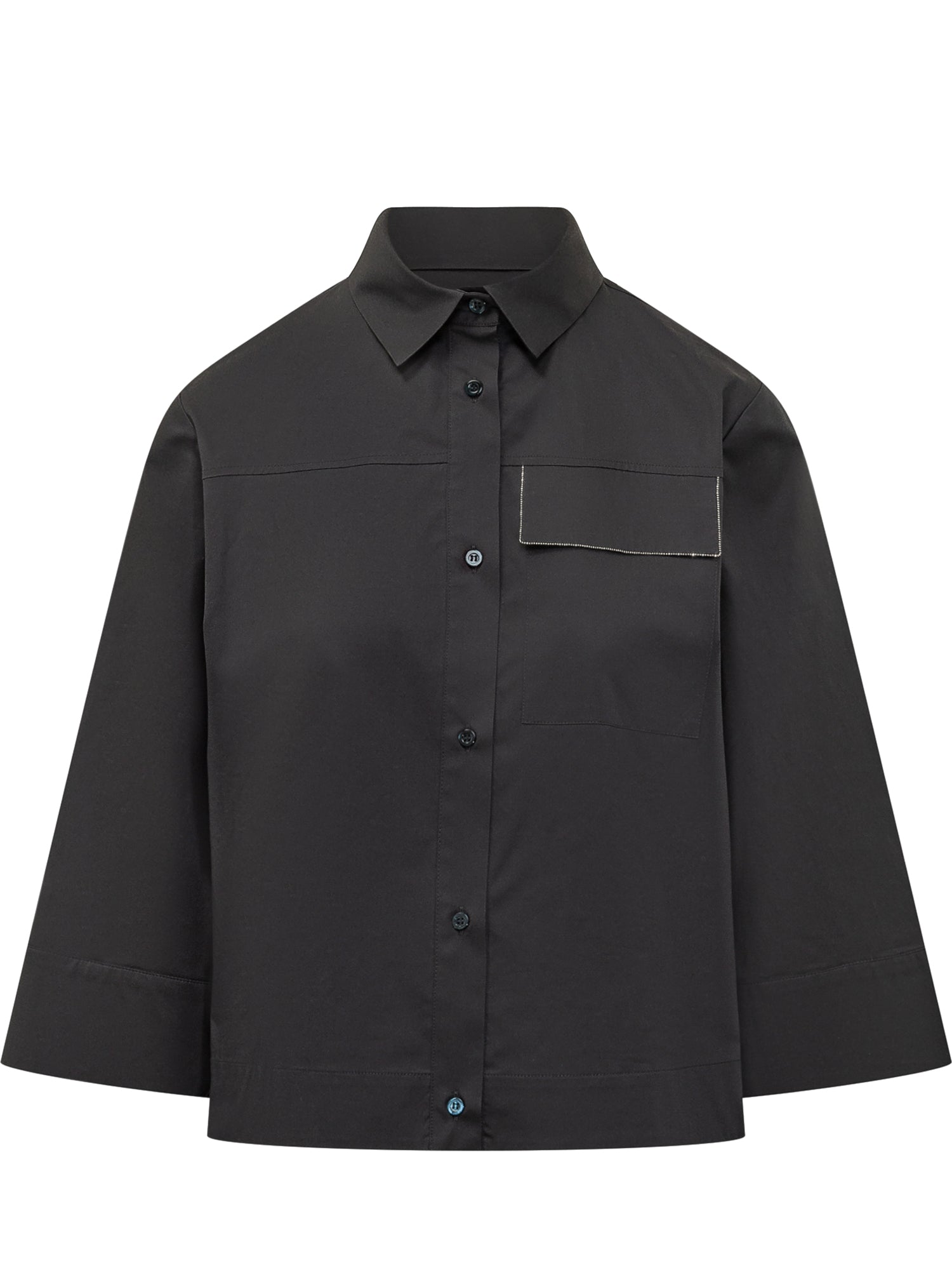 Camicia con colletto classico e chiusura frontale con bottoni. Modello con maniche ampie a lunghezza tre quarti e tasca applicata sul petto con profilo a contrasto, linea dritta e design pulito.