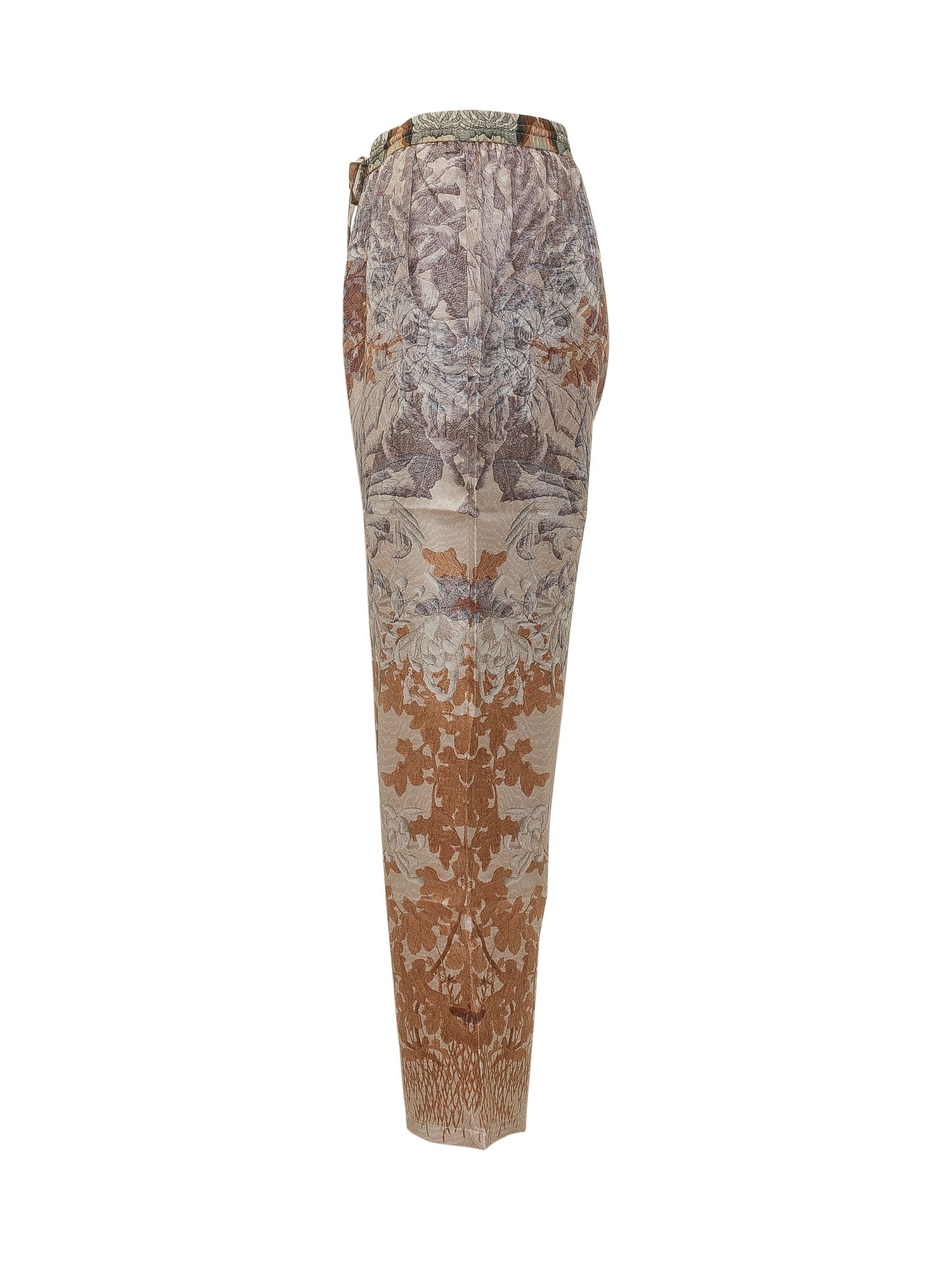 Pantaloni lunghi realizzati in tessuto leggero con stampa floreale e naturalistica all-over. Il modello presenta vita elasticizzata con coulisse regolabile e gamba dritta dalla linea fluida, per una vestibilità comoda e raffinata. Ideali per creare look eleganti e rilassati.