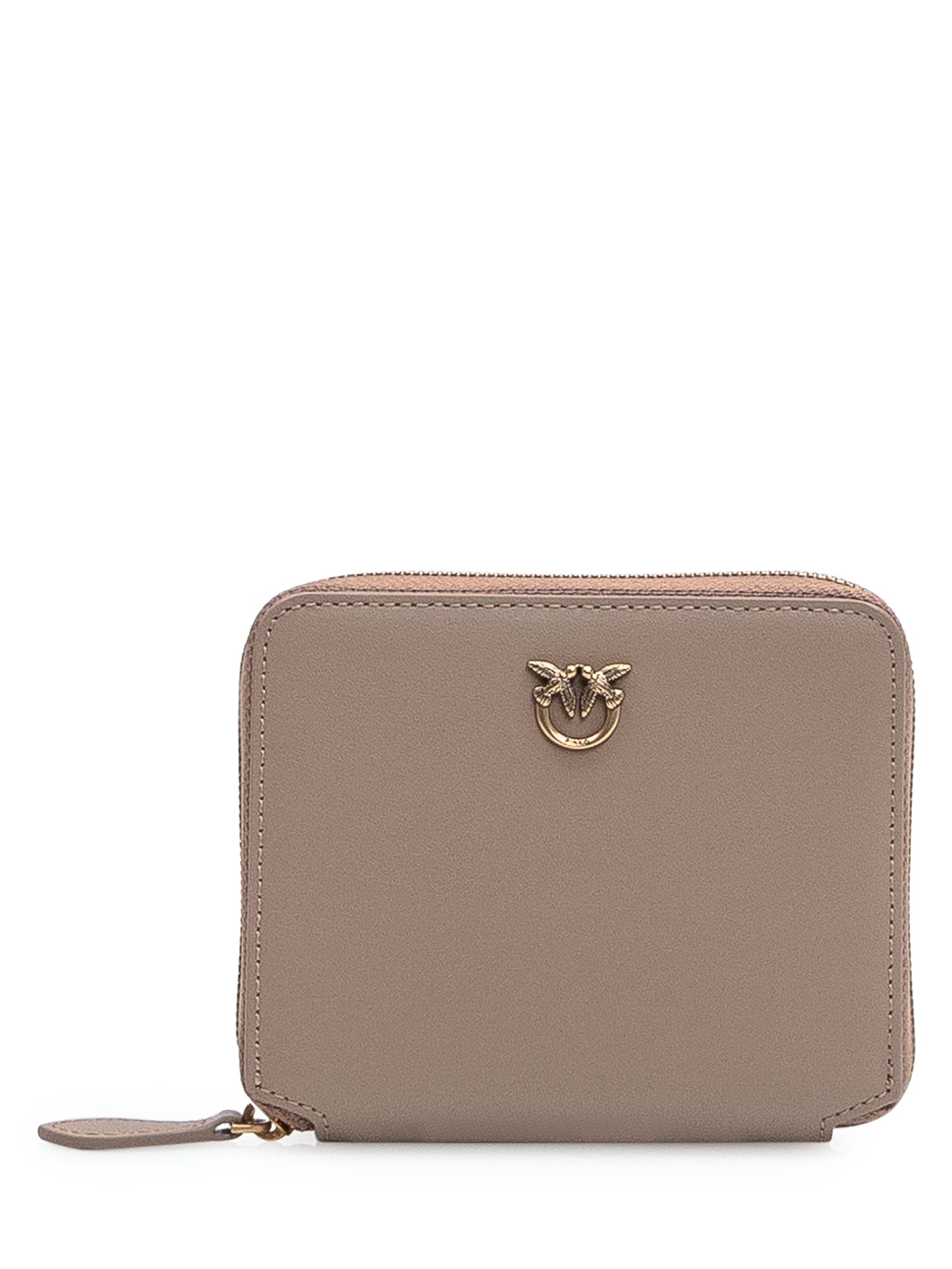 Portafoglio Pinko in pelle taupe con chiusura a zip e logo Love Birds dorato.