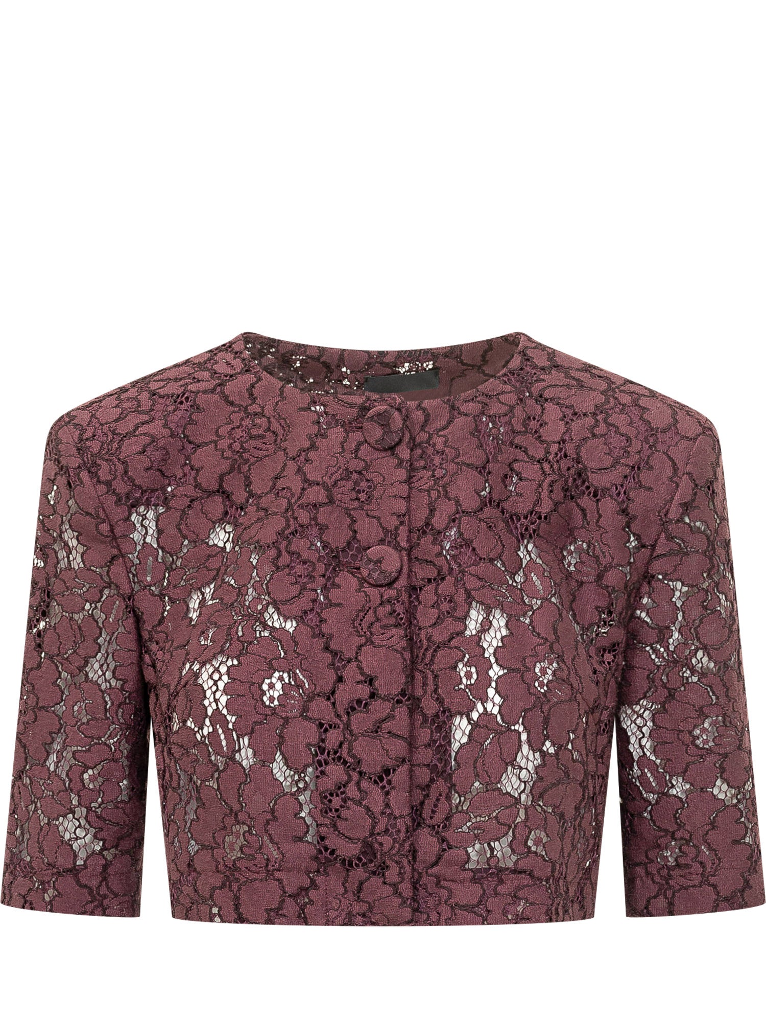 Spencer corto realizzato in delicato pizzo floreale, caratterizzato da scollo rotondo e chiusura frontale con bottoni rivestiti. Modello con maniche a tre quarti e lavorazione semi-trasparente che dona un tocco romantico ed elegante, perfetto da abbinare ad abiti e top coordinati.