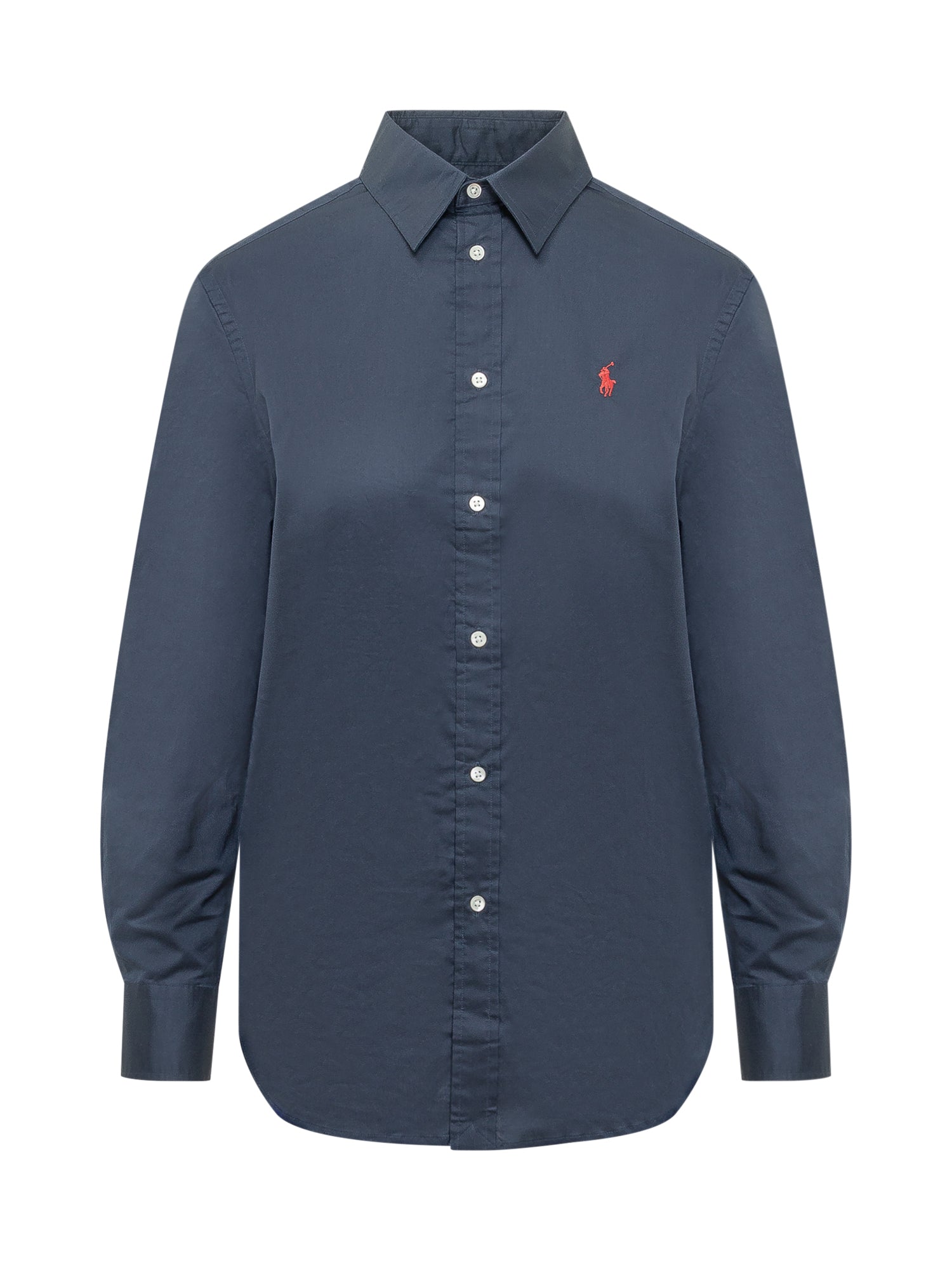 Camicia da donna, colletto classico, chiusura frontale con bottoni, maniche lunghe con polsini, linea leggermente sagomata, ricamo sul petto.