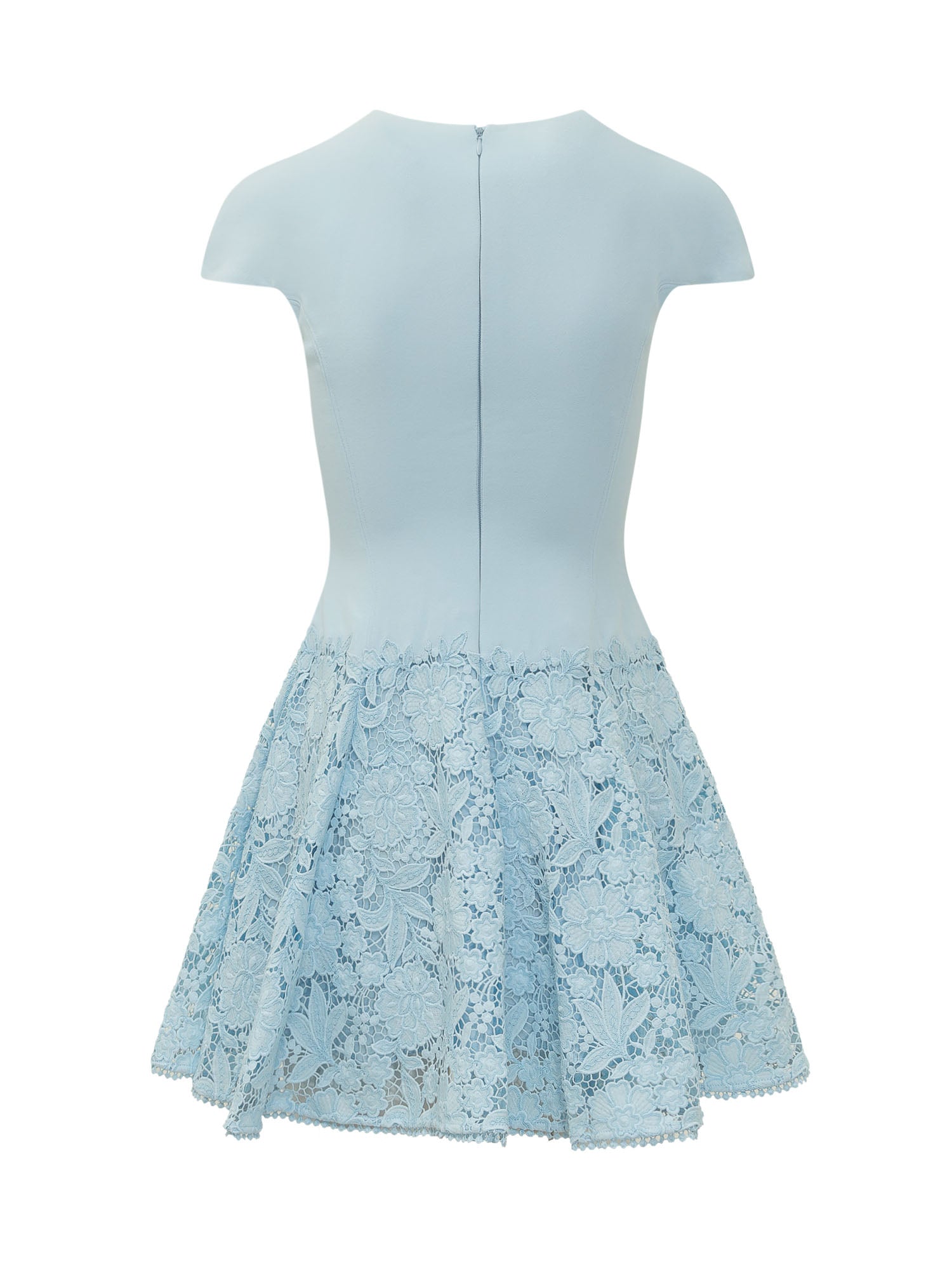 Aabito mini da donna in crepe azzurro con maniche corte e busto aderente. La gonna svasata in pizzo floreale dona movimento ed eleganza, perfetto per cerimonie, eventi e occasioni speciali.