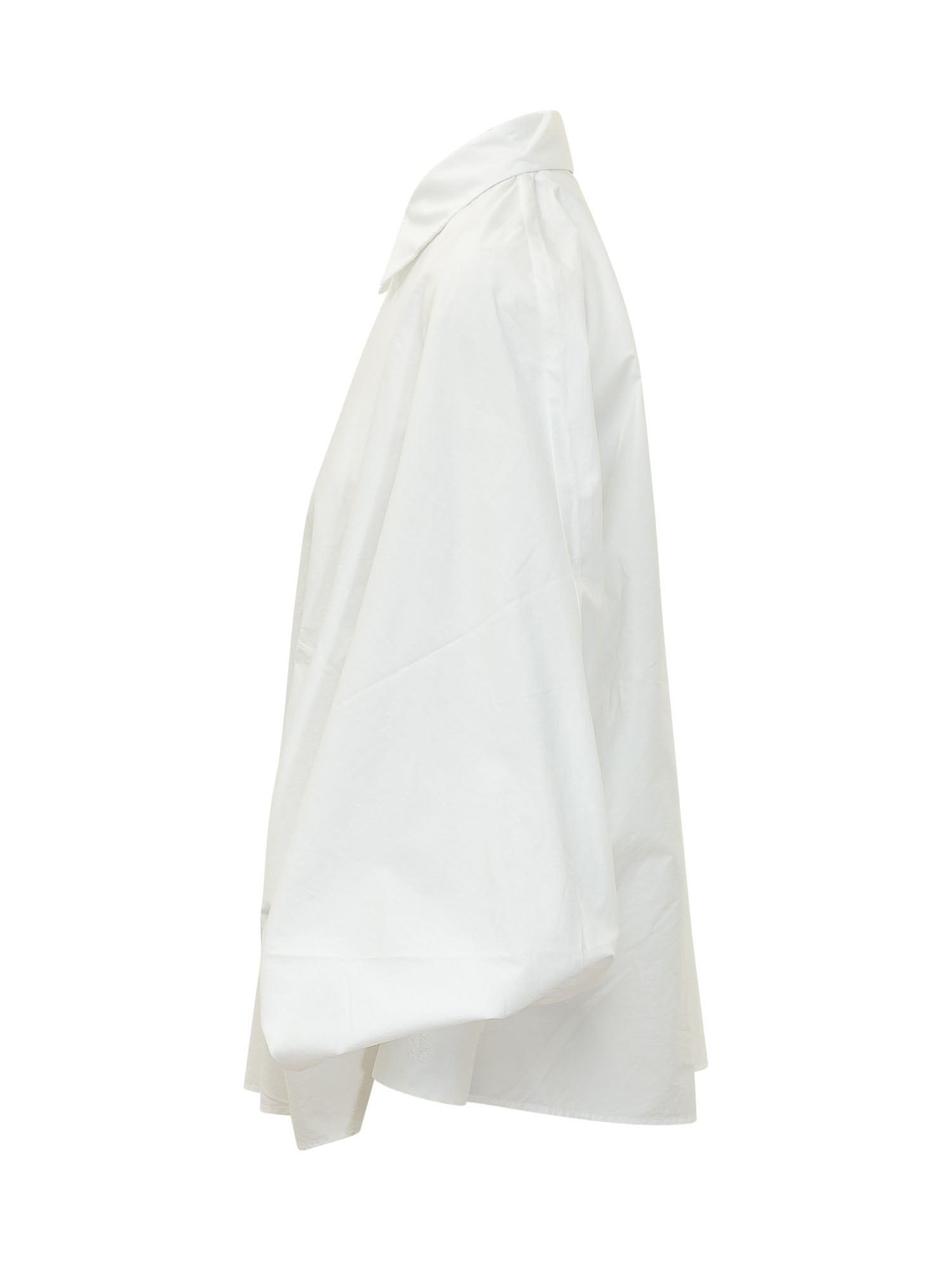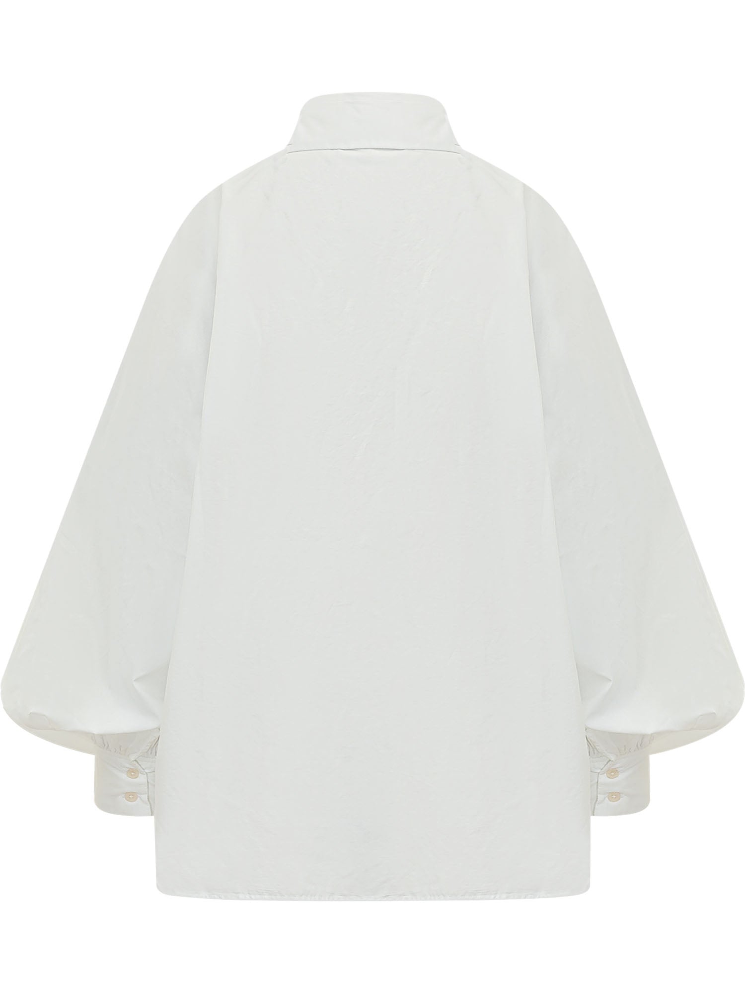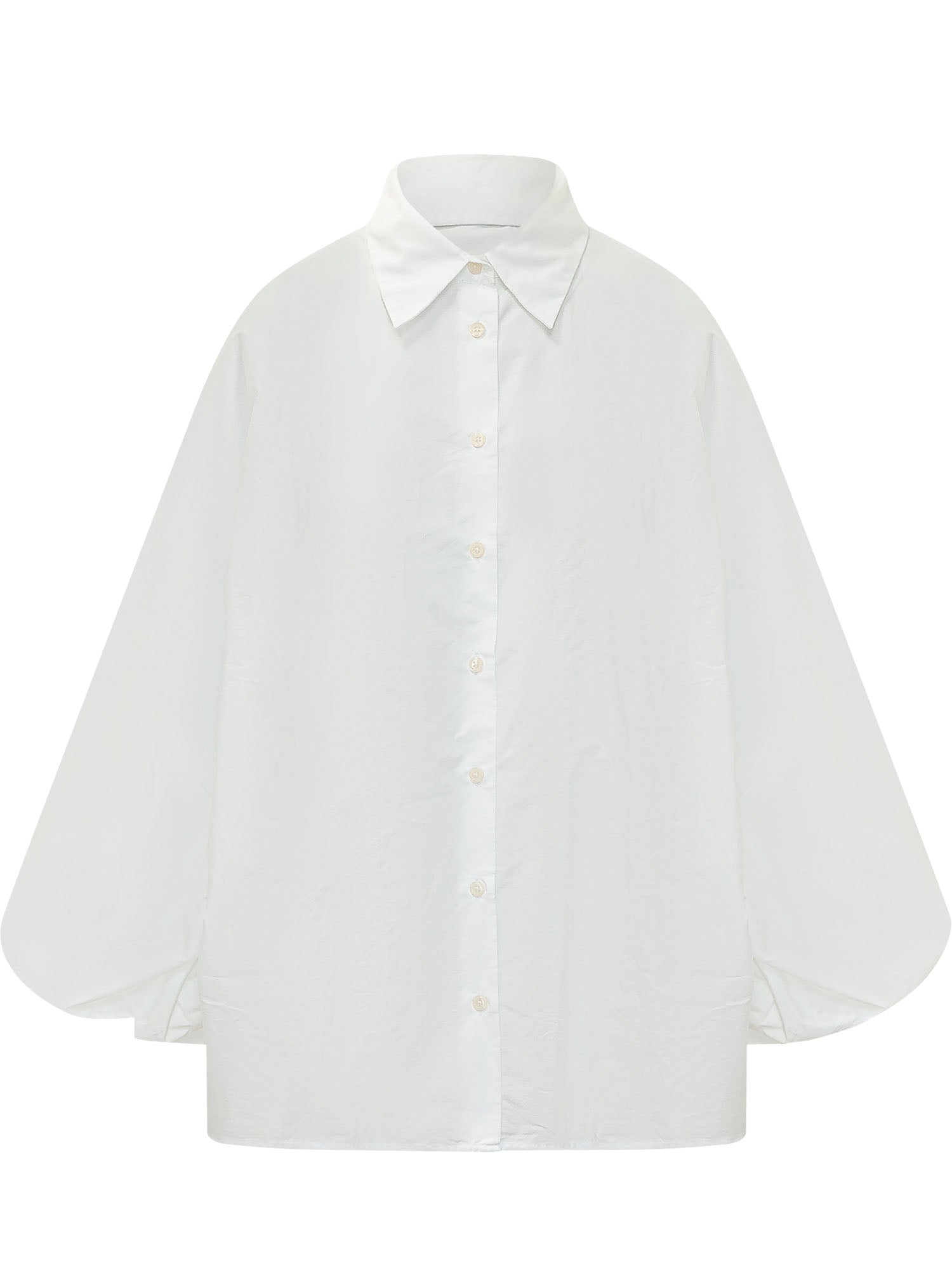 Camicia ampia con colletto classico, chiusura frontale con bottoni e maniche lunghe con volume, design pulito e linea morbida
