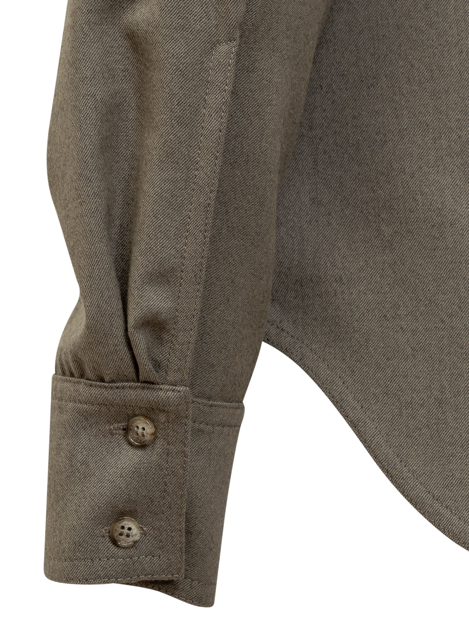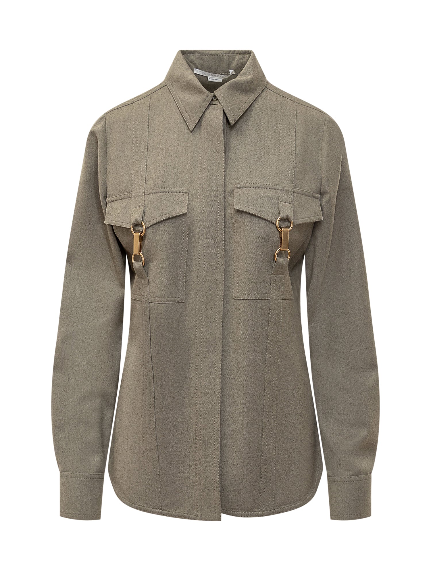 Camicia a maniche lunghe in lana. Colletto a punta. Chiusura con bottoni nascosti. Polsini con bottoni. Dettagli con pannelli piatti lungo il petto. Due tasche con patta sul petto. Fibbie in oro su ogni tasca.