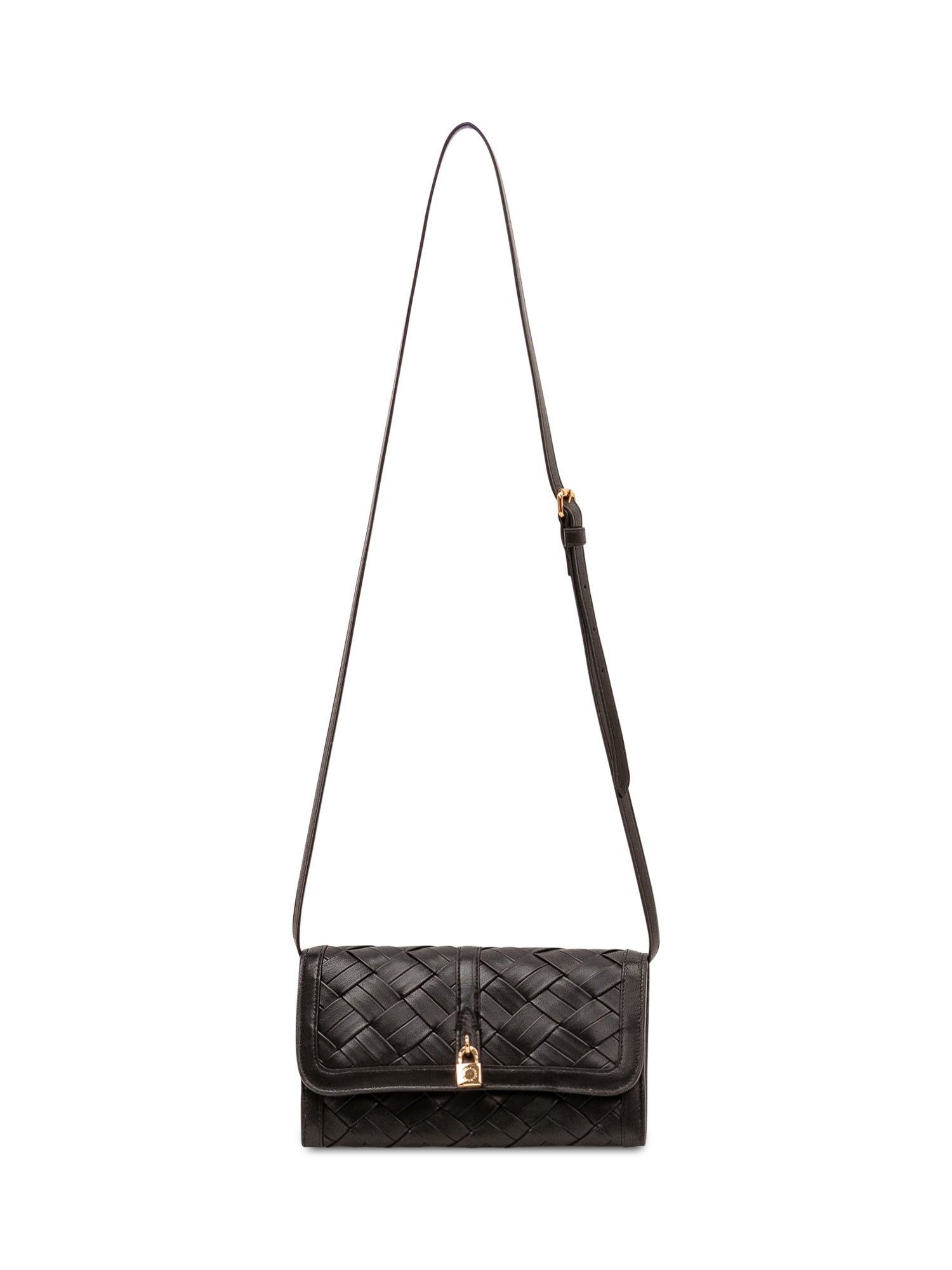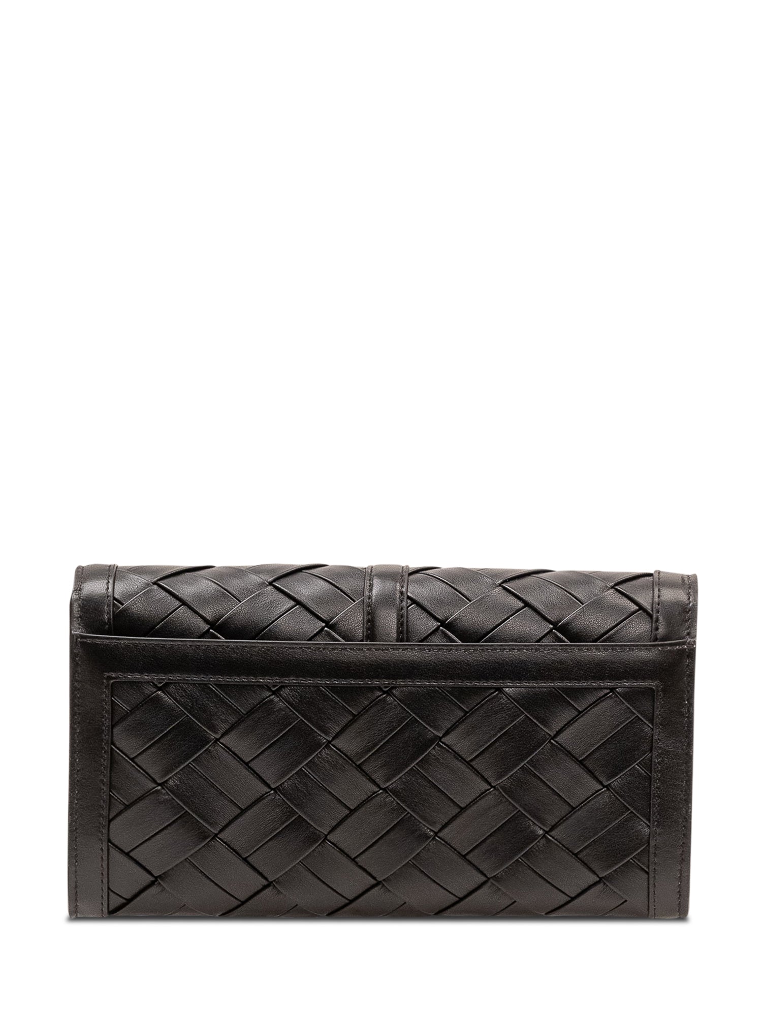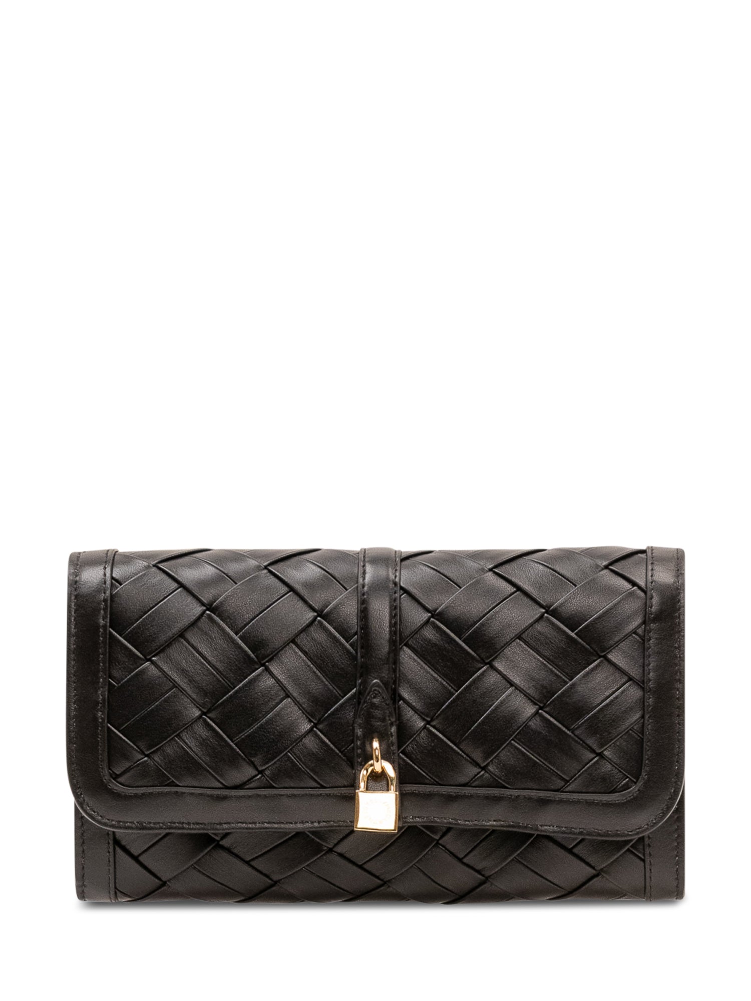 Portafoglio con struttura rettangolare, patta frontale e lavorazione intrecciata, dettaglio con pendente metallico e chiusura visibile