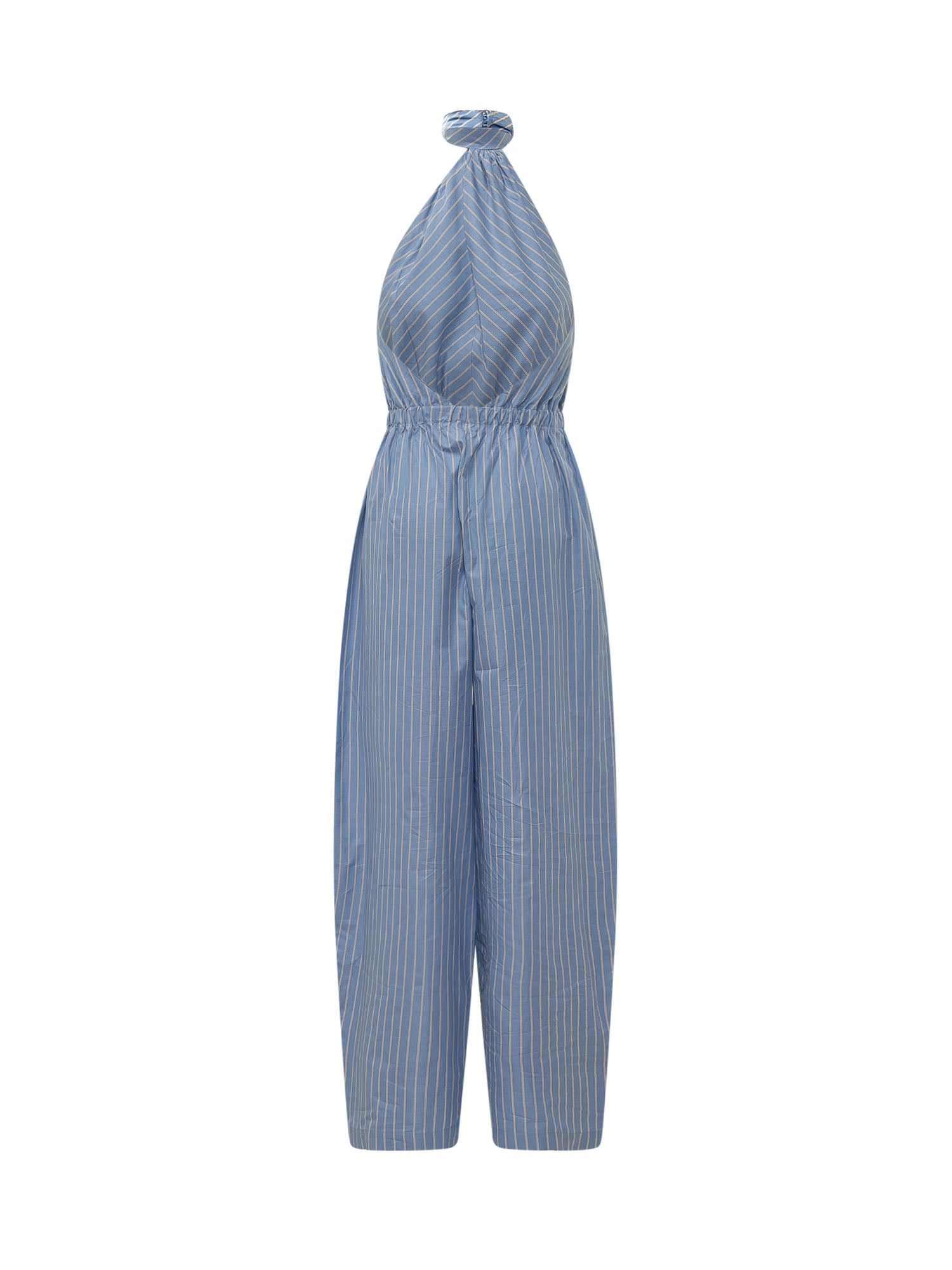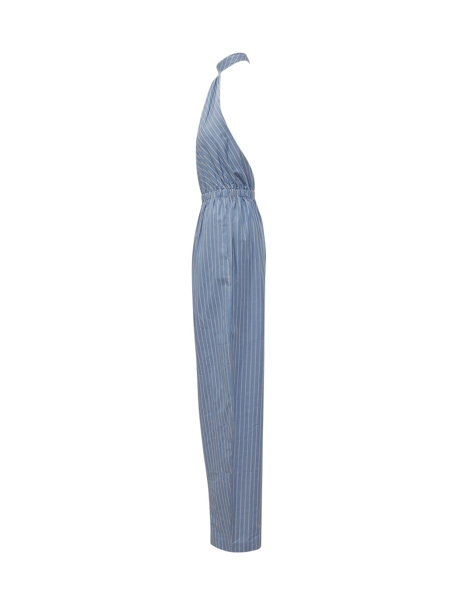 Tuta lunga con collo halter e chiusura posteriore, vita elasticizzata e motivo a righe, gamba ampia.